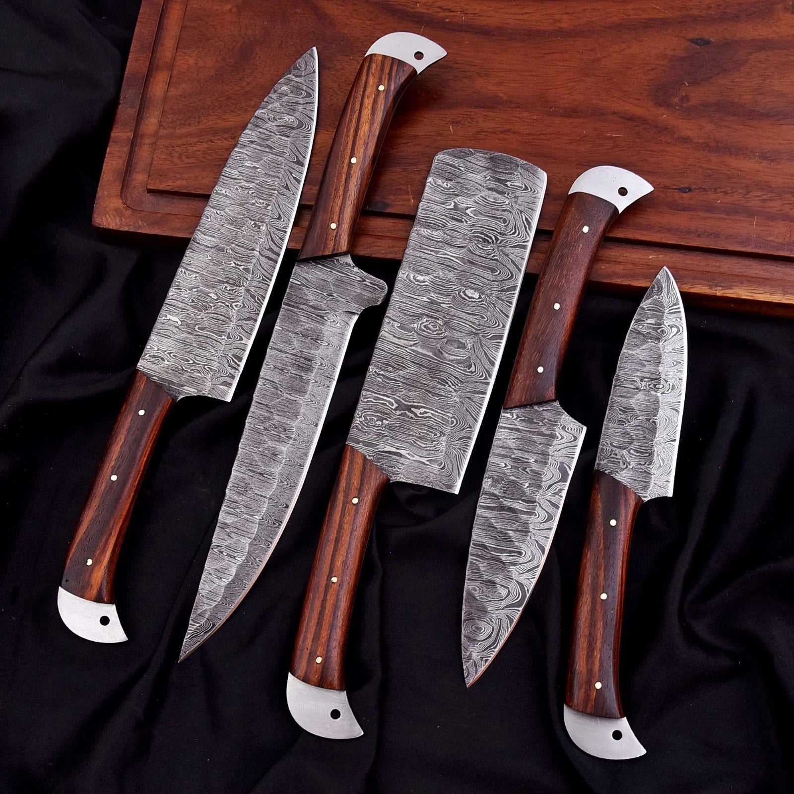 Custom Handmade Damascus 5-Piece Chef Knife Set – Solid Wood Handle with Leather Bag | Arham Cutlery