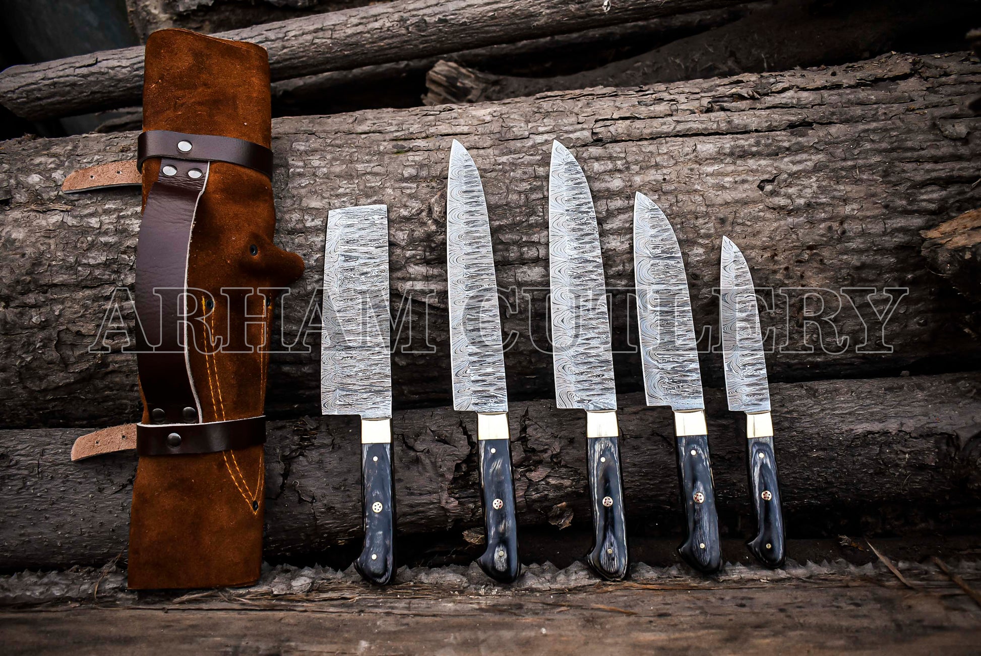 Hand Forged Damascus Steel Chef Set 5-Pcs With Leather Roll Kit - Arham Cutlery - Best Gift For Wife - Best Kitchen Knife Set - Best Chef Set