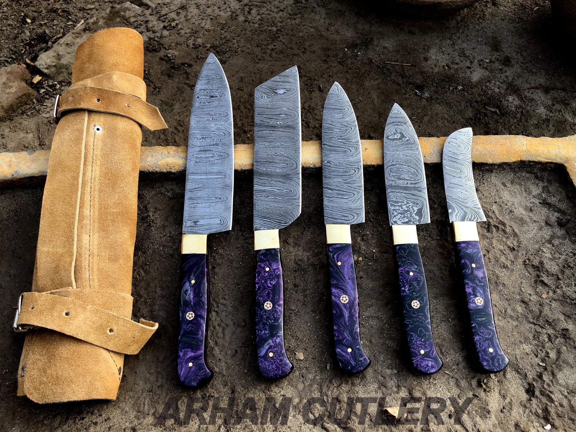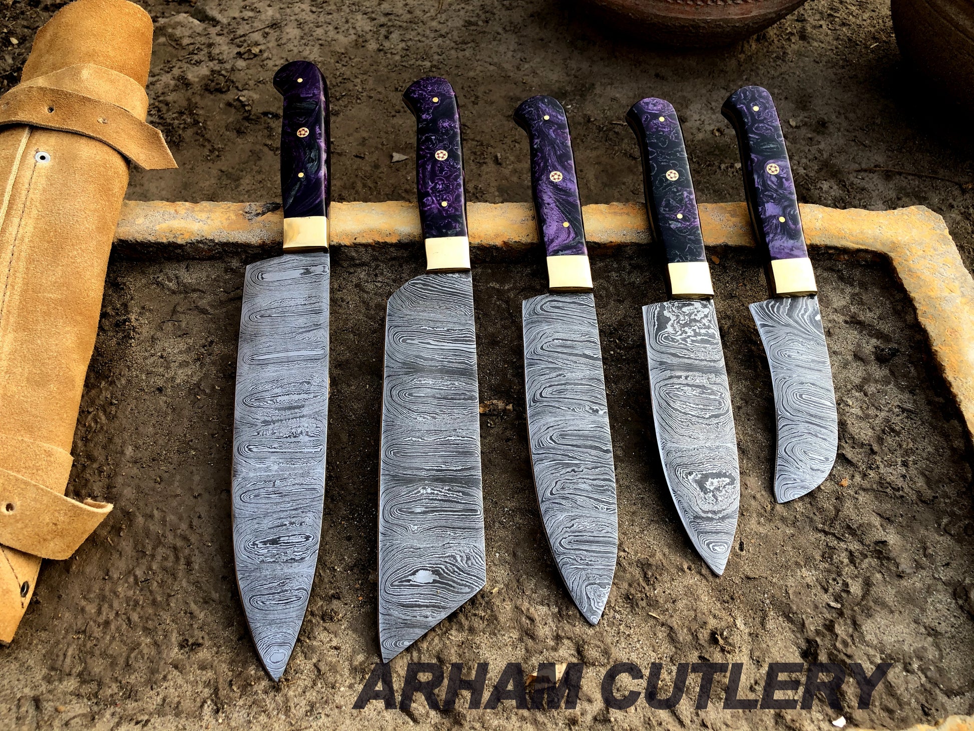 Damascus Steel Hand Forged Set Of 5 With Leather Roll Kit , Kitchen Knife , Arham Cutlery