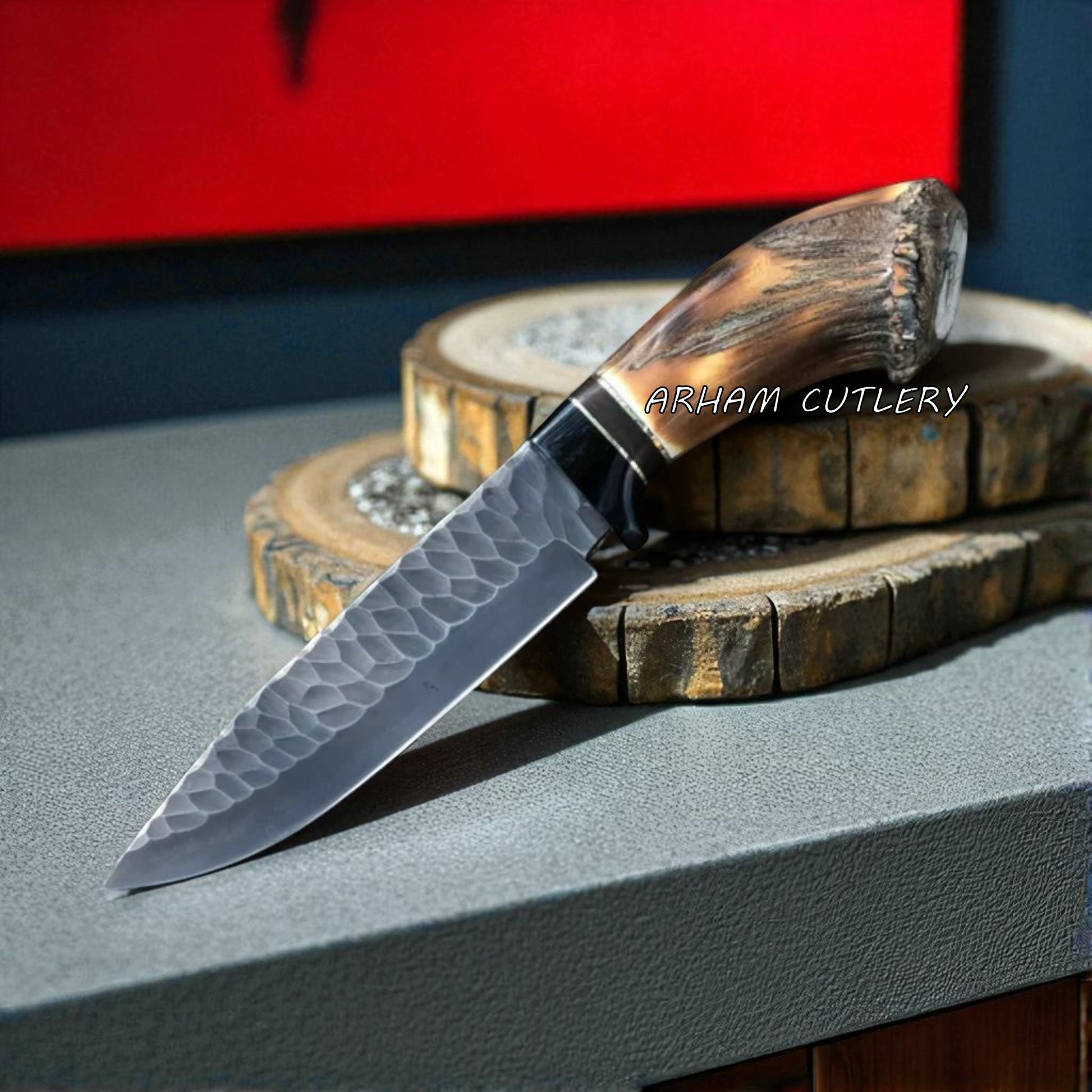 This handcrafted knife is built for hunters, ranchers, and outdoor warriors. Forged from 1095 high-carbon steel, the blade features a hammered finish for durability and reduced friction. The handle is crafted from natural stag horn, offering a rugged grip that feels like part of your hand.