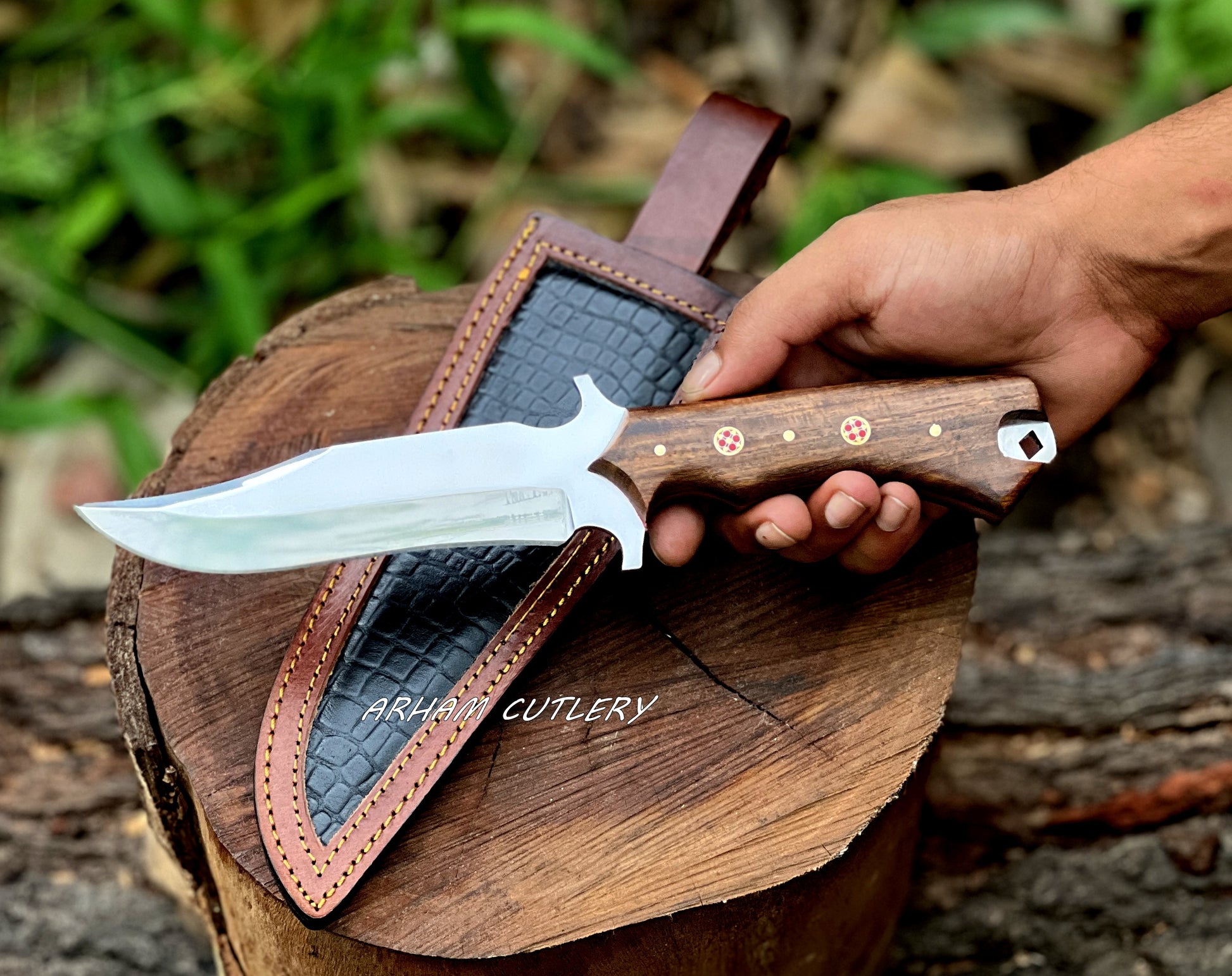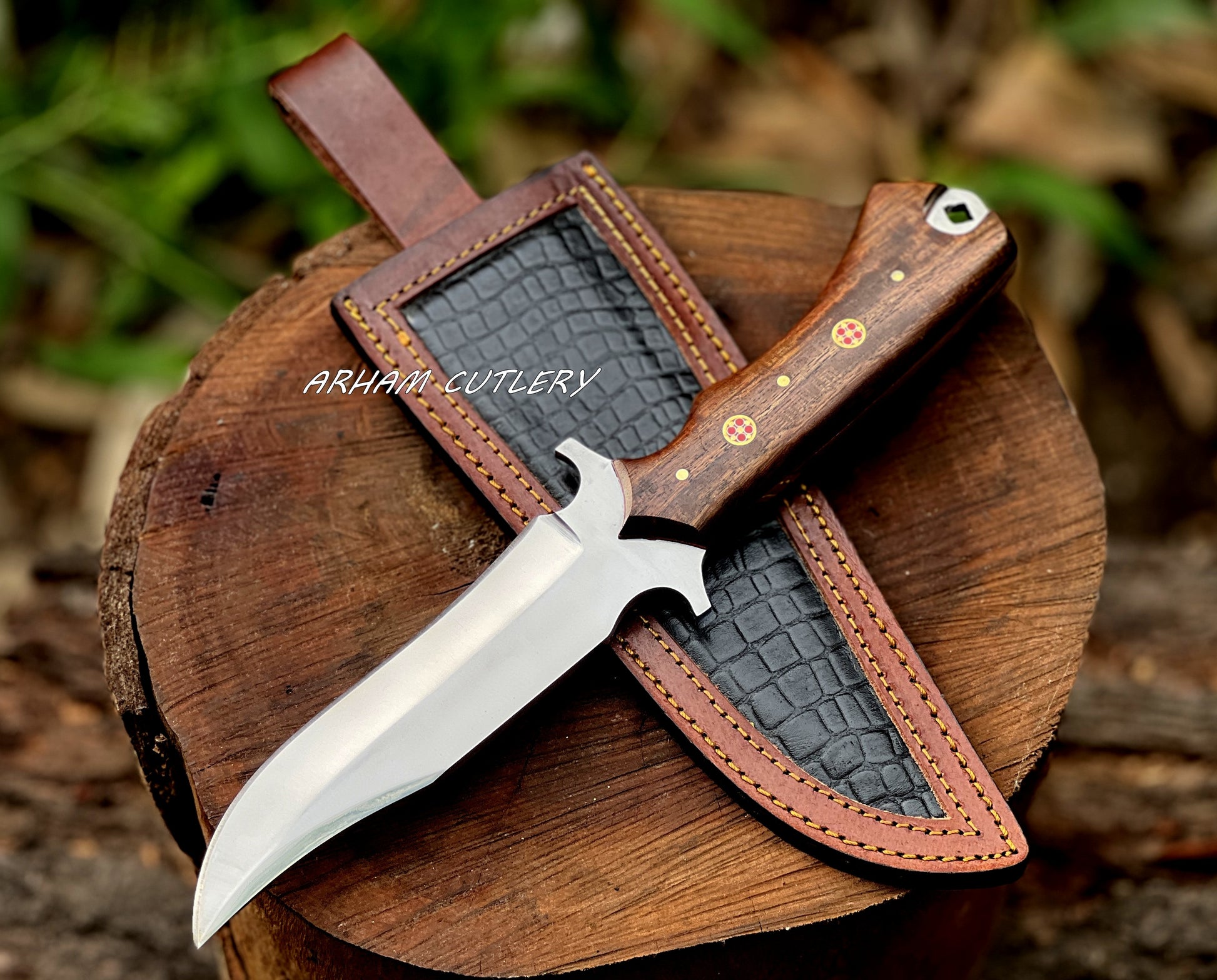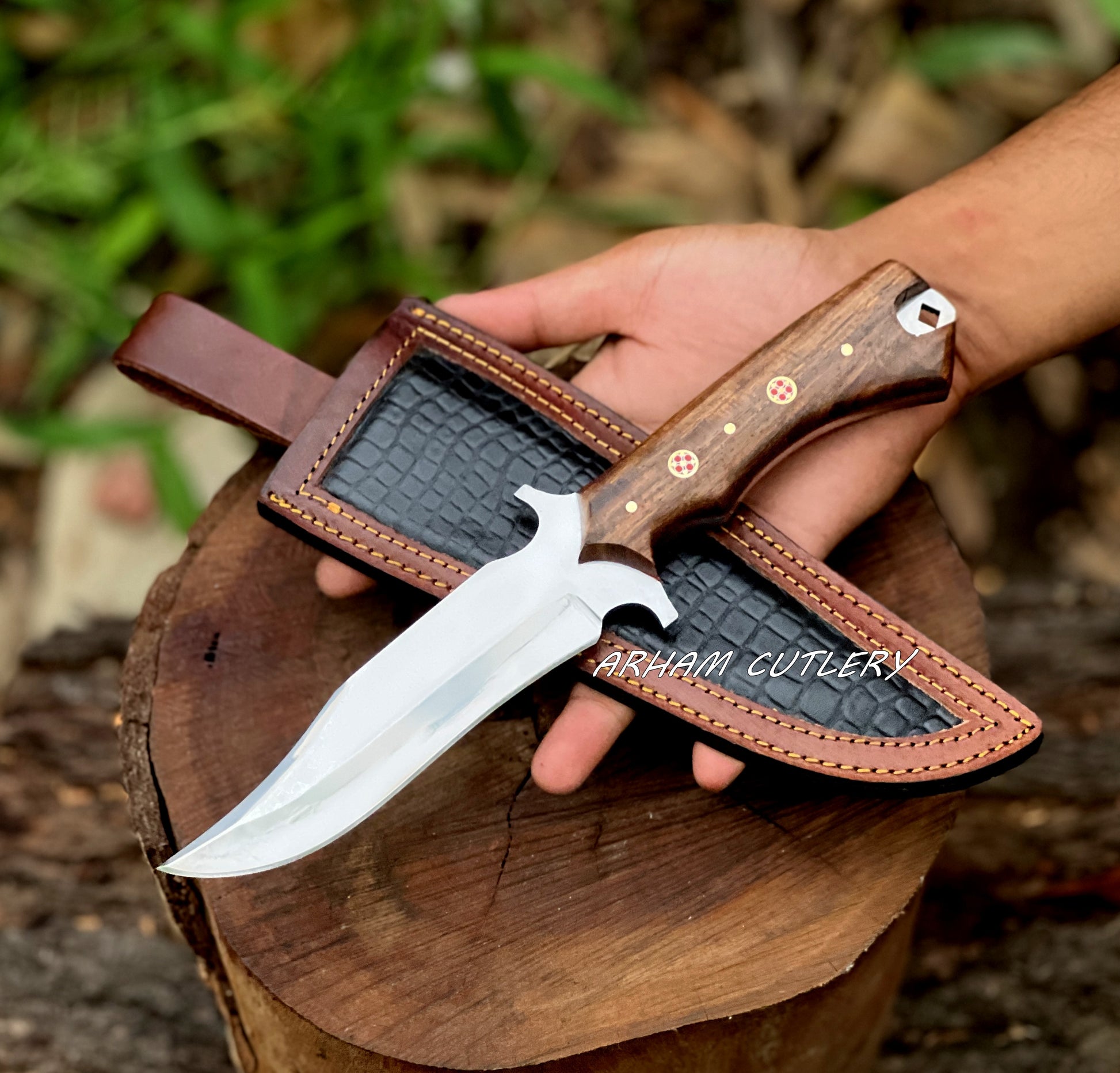 This premium handmade hunting knife from Arham Cutlery is built for performance, durability, and elegance. Forged from D2 tool steel, the blade offers superior edge retention, toughness, and corrosion resistance. The mirror-polished finish highlights its sleek, razor-sharp design while making it a standout in any collection.