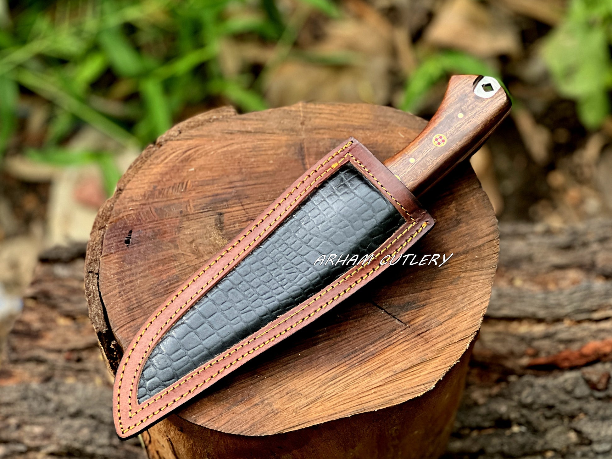 The handle is crafted from high-quality rosewood, featuring mosaic pins for an elegant touch and a secure grip. Designed for hunters, campers, and outdoor enthusiasts, this knife delivers power and precision in every cut. It comes with a hand-stitched leather sheath for safe storage and easy carry.