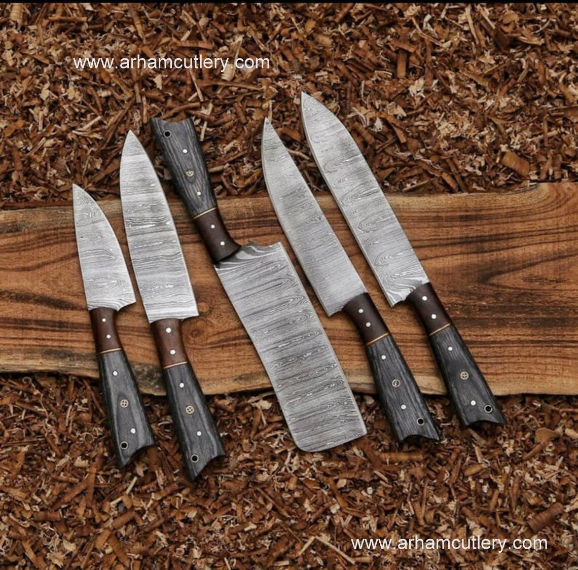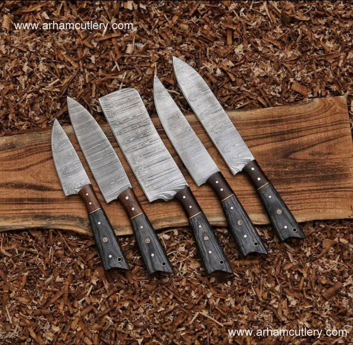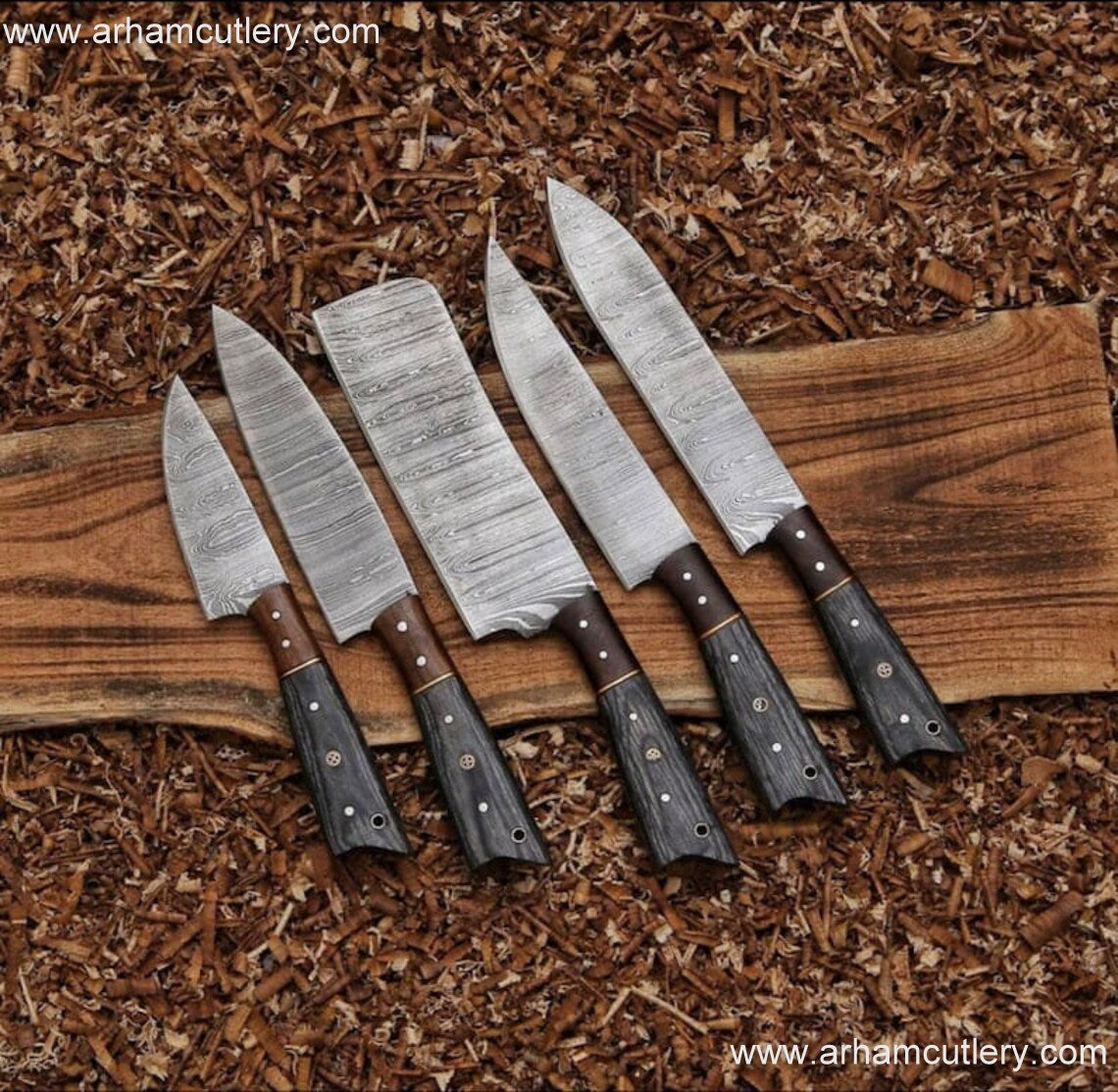 Handmade Damascus Steel 5 PCs Kitchen Knife Set With Leather Roll Kit | Arham Cutlery