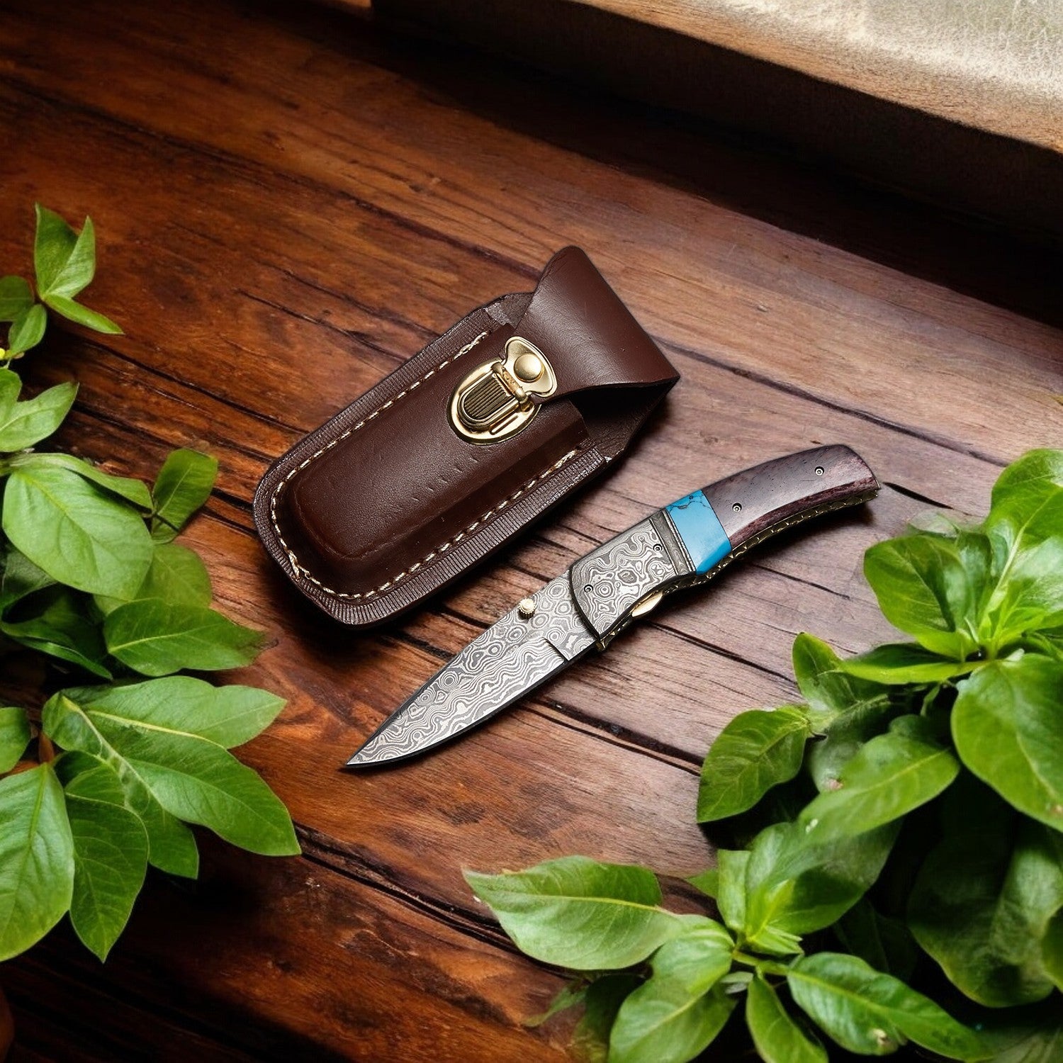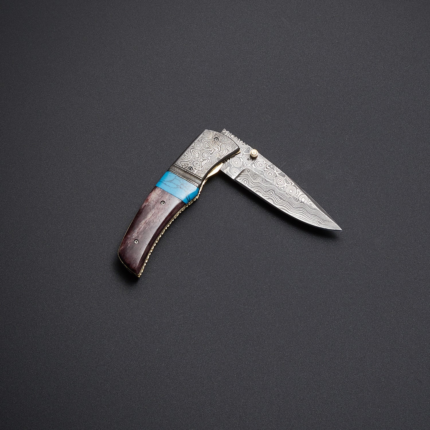 This Damascus Turquoise + Red Bone Pocket Knife is handmade, with a 396-layer Damascus steel forged blade, forged using 1084 high carbon and 15N20 nickel carbon. The blade is heat treated to 58-60HRC and is balanced and sharp. Each knife is matched up with a custom handcrafted buffalo-leather belt sheath, and you will not find a better Damascus folding knife or sheath on the market for the price.
