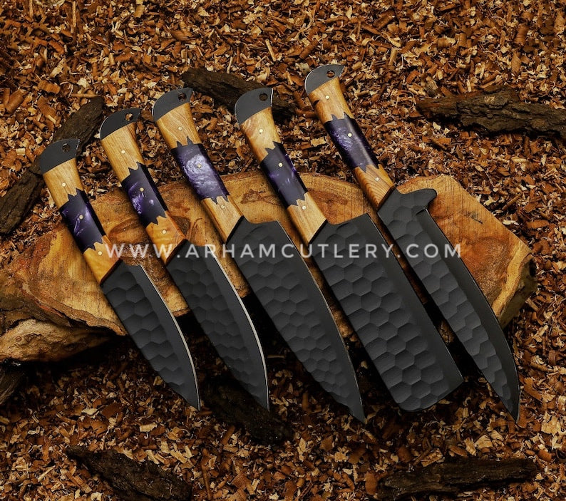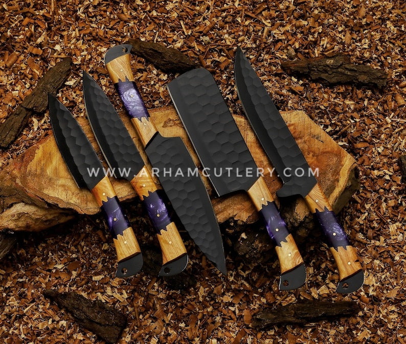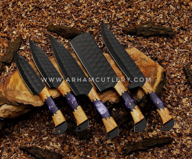 Handmade Knives Set, Kitchen knives set, Chef knives set, Damascus chef set, Steel knife set with leather Sheath | Arham Cutlery
