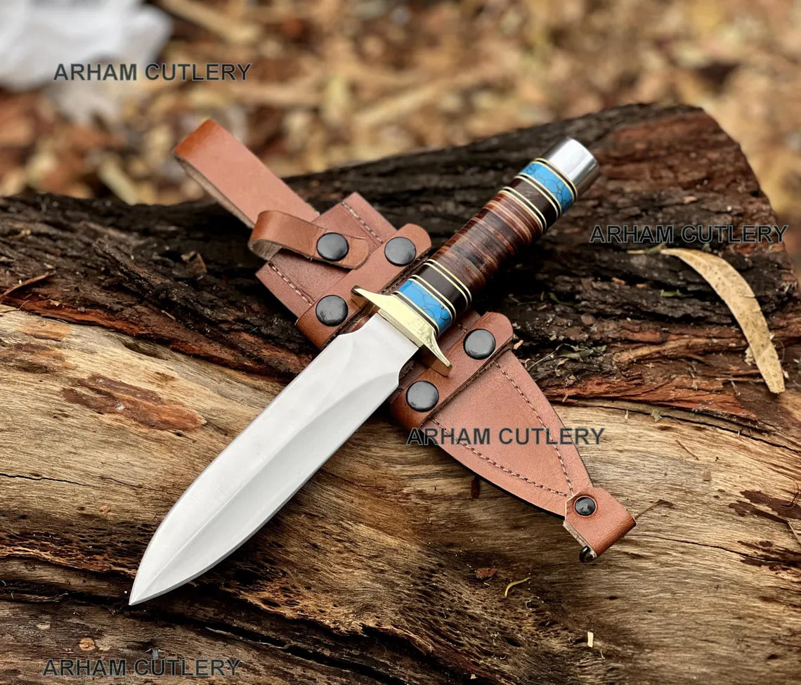 — Handle Materials: Brass Hand Guard And Stainless Pommel, Stacked Leather, Blue Turquoise Stone, Black & White Fiber Spacer Handle