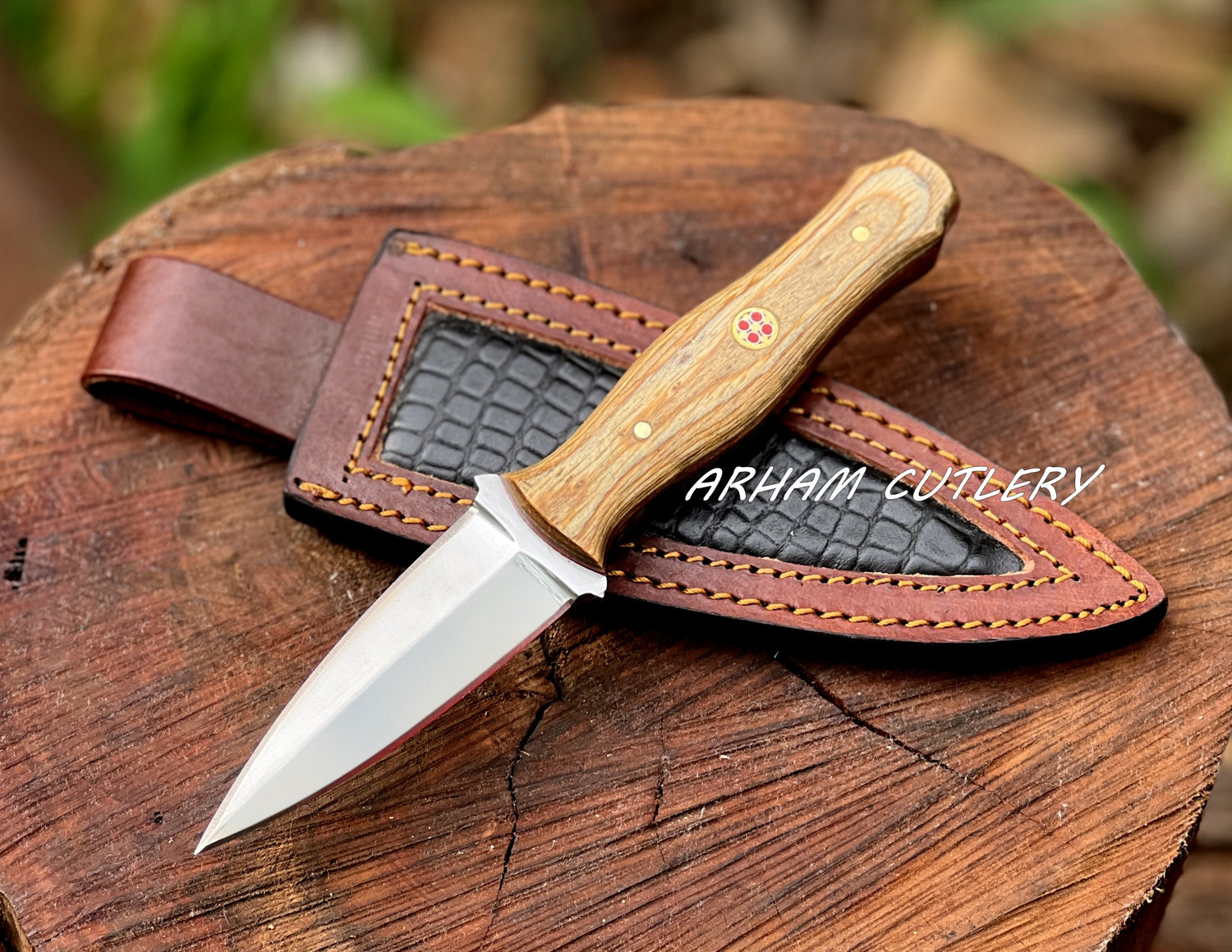 Handmade 11" D2 Steel Hunting Knife – Olive Wood Handle, Etched Blade & Leather Sheath | ARHAM CUTLERY
