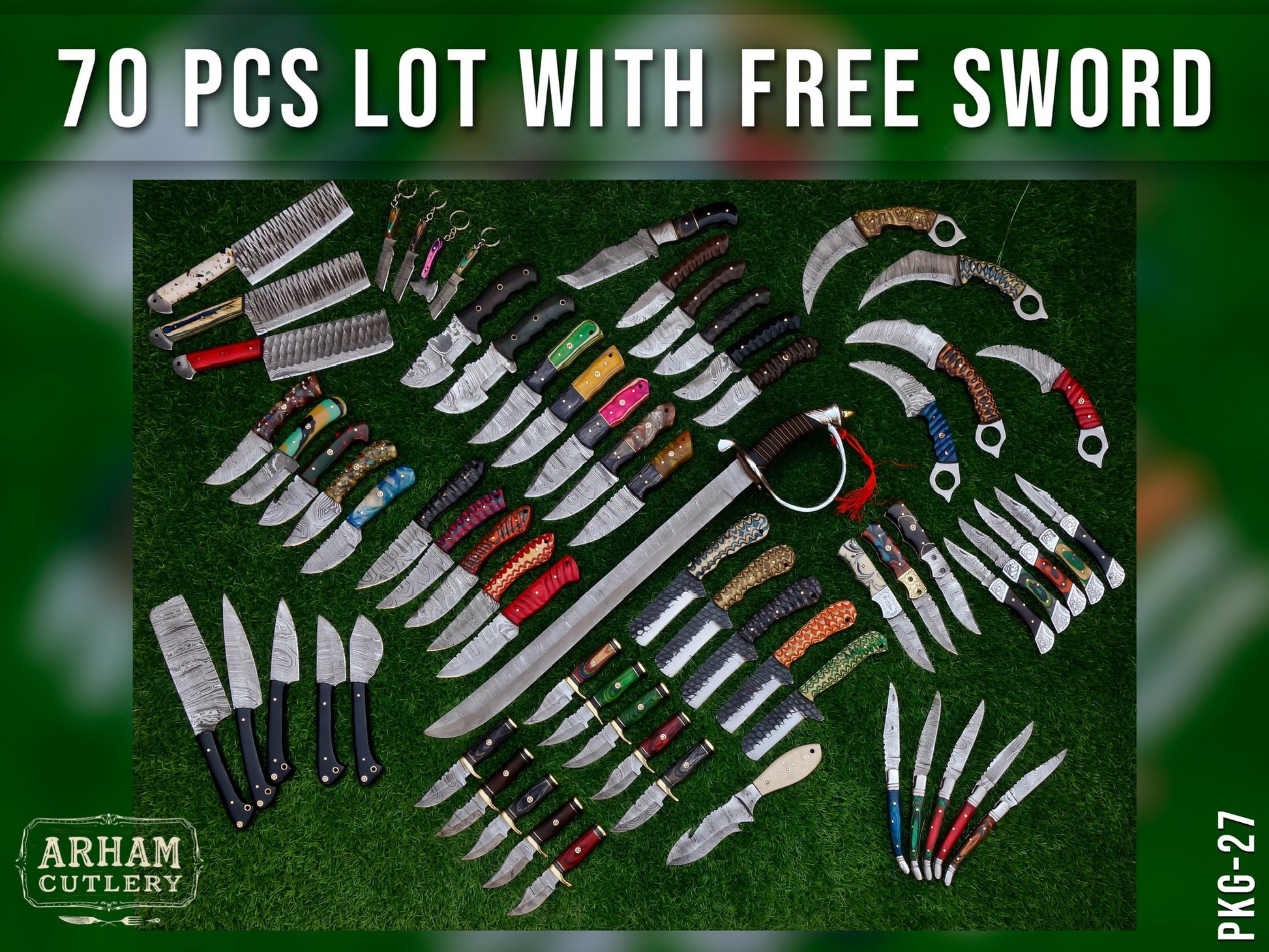70 PCS Handmade Knife Lot with FREE Sword – Mixed Damascus & Stainless Steel | Arham Cutlery