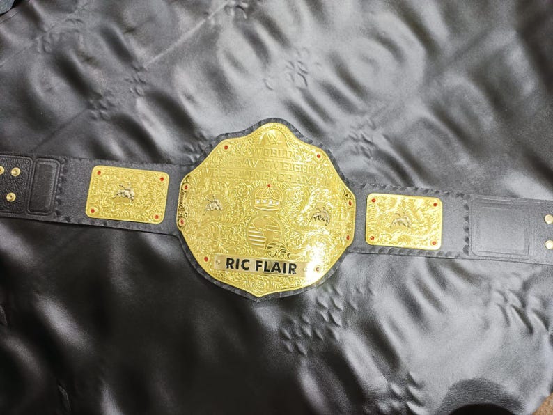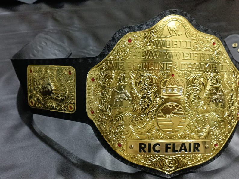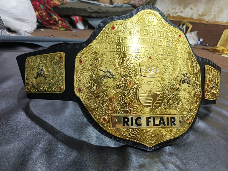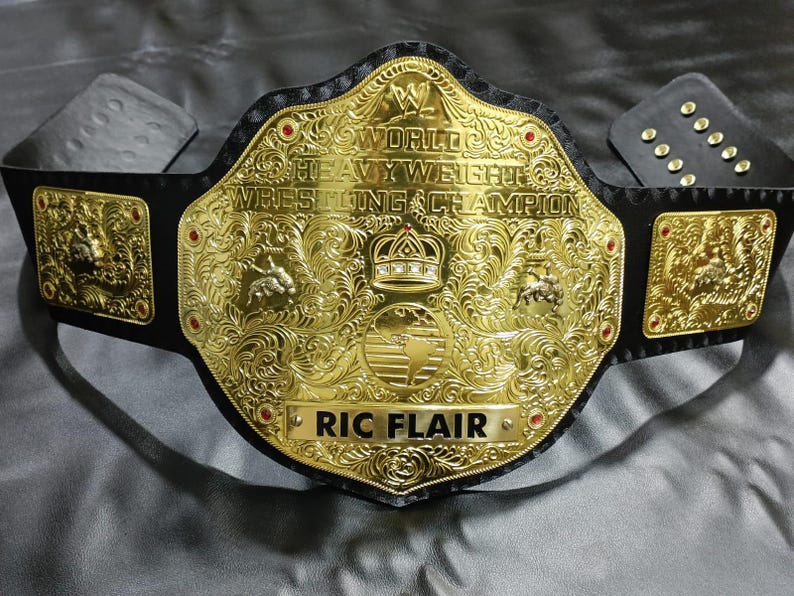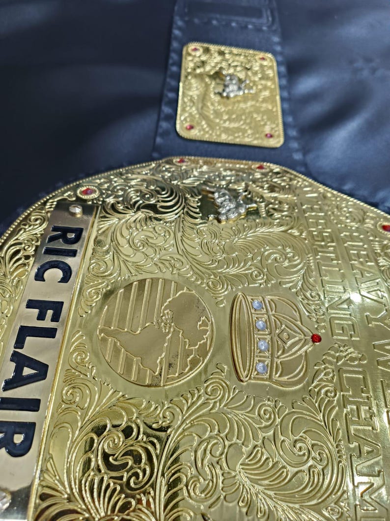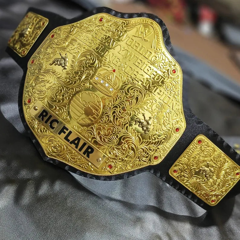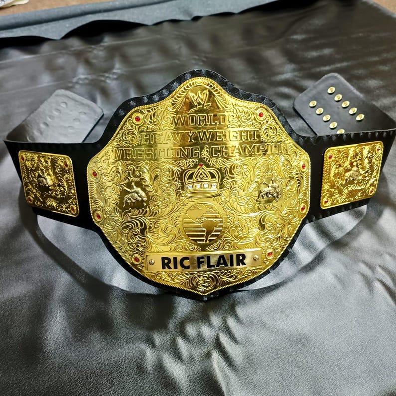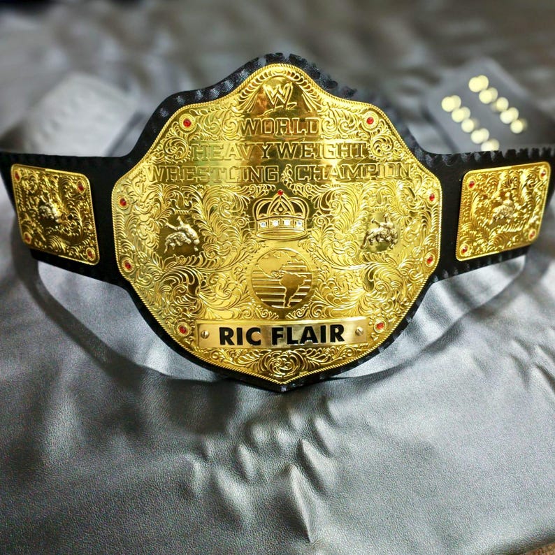 Big Gold World Heavyweight wrestling Title belt with Ric Flare Name Plate, 2mm Brass plates Adult Size