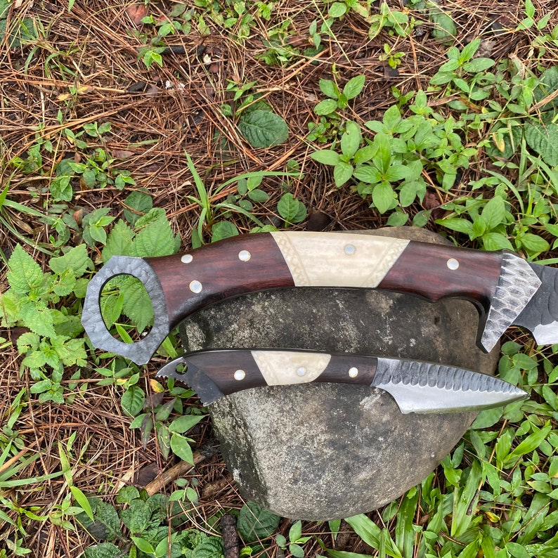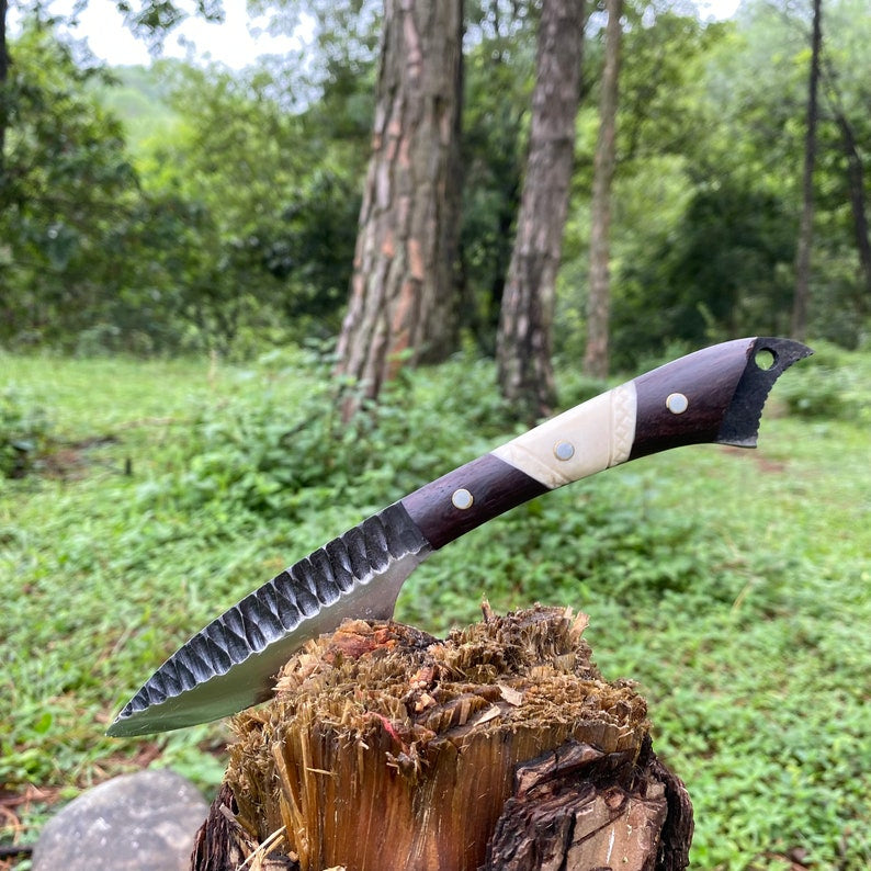 This Bowie Knife's primary blade was expertly made by hand in Nepal from premium supplies. The truck leaf spring (5160) used to make the blade is a prime example of the material's strength and longevity. The bone handle makes for an interesting and secure grip. This knife comes ready to use, its edge honed for safe and effective cutting.