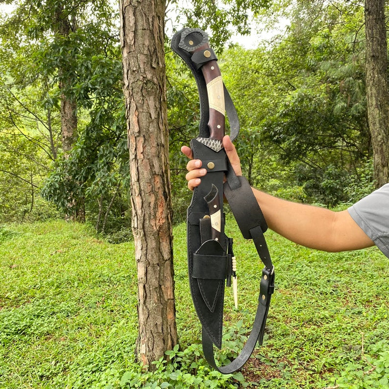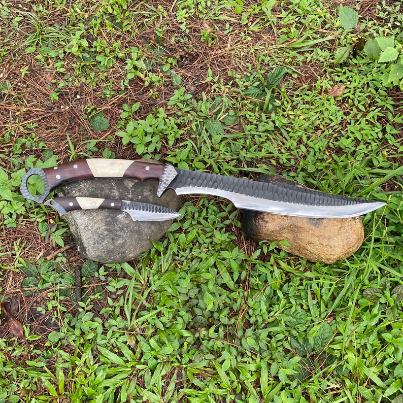 The primary blade of this Bowie knife is 15 inches long, drawing emphasis to its unique design. The rosewood 11-inch handle features a full tang for superior grip and support. There is a nice equilibrium between practicality and beauty in the blade and handle materials.