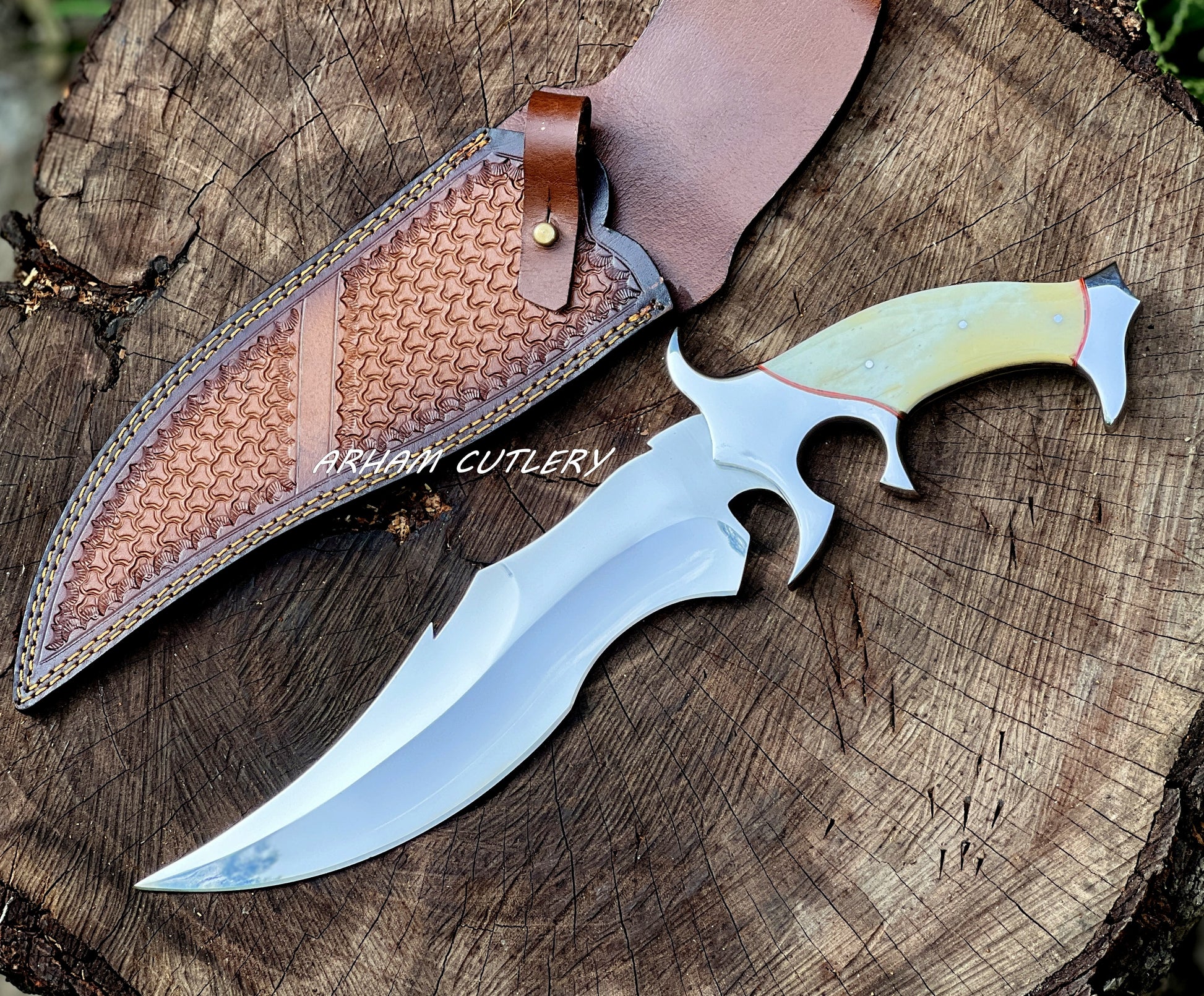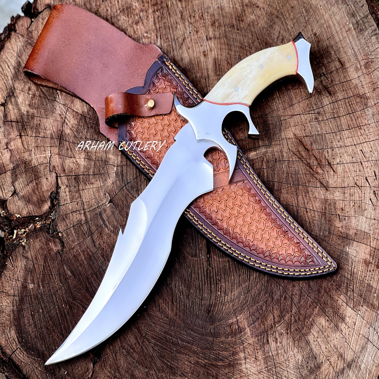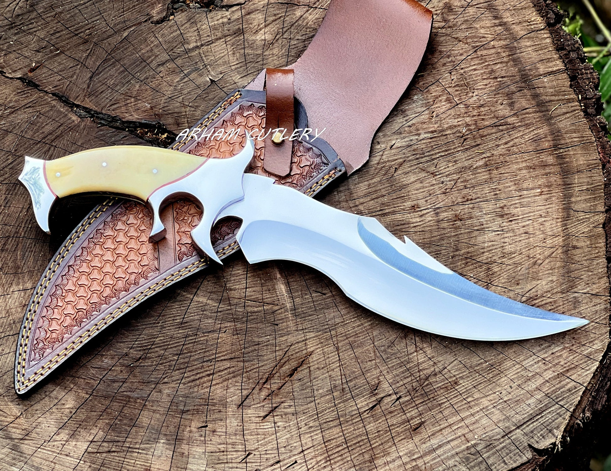 This handmade D2 steel hunting knife is crafted with precision and care, making it the perfect tool for hunters, campers, and collectors. The razor-sharp D2 steel blade ensures excellent edge retention and durability, while the natural camel bone handle provides a comfortable grip and a unique, timeless look.