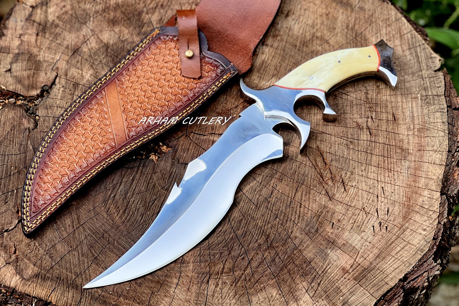 Custom Handmade D2 Steel Hunting Knife with Camel Bone Handle Steel Bolster & Leather Sheath Outdoor Camping Collectors Knife
