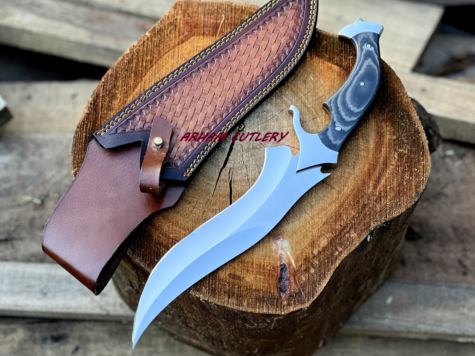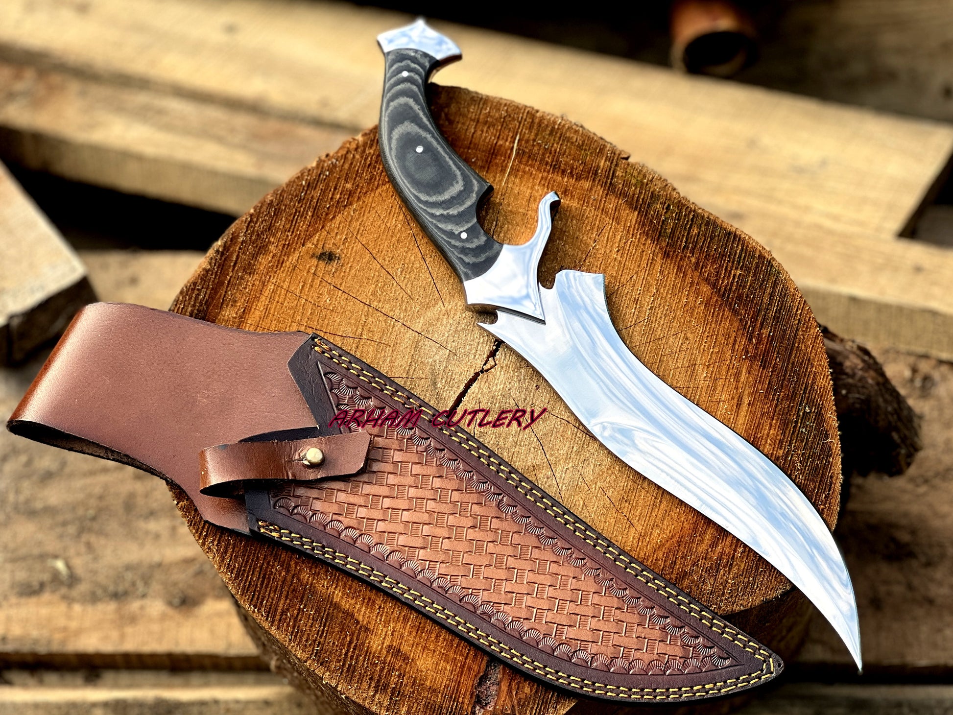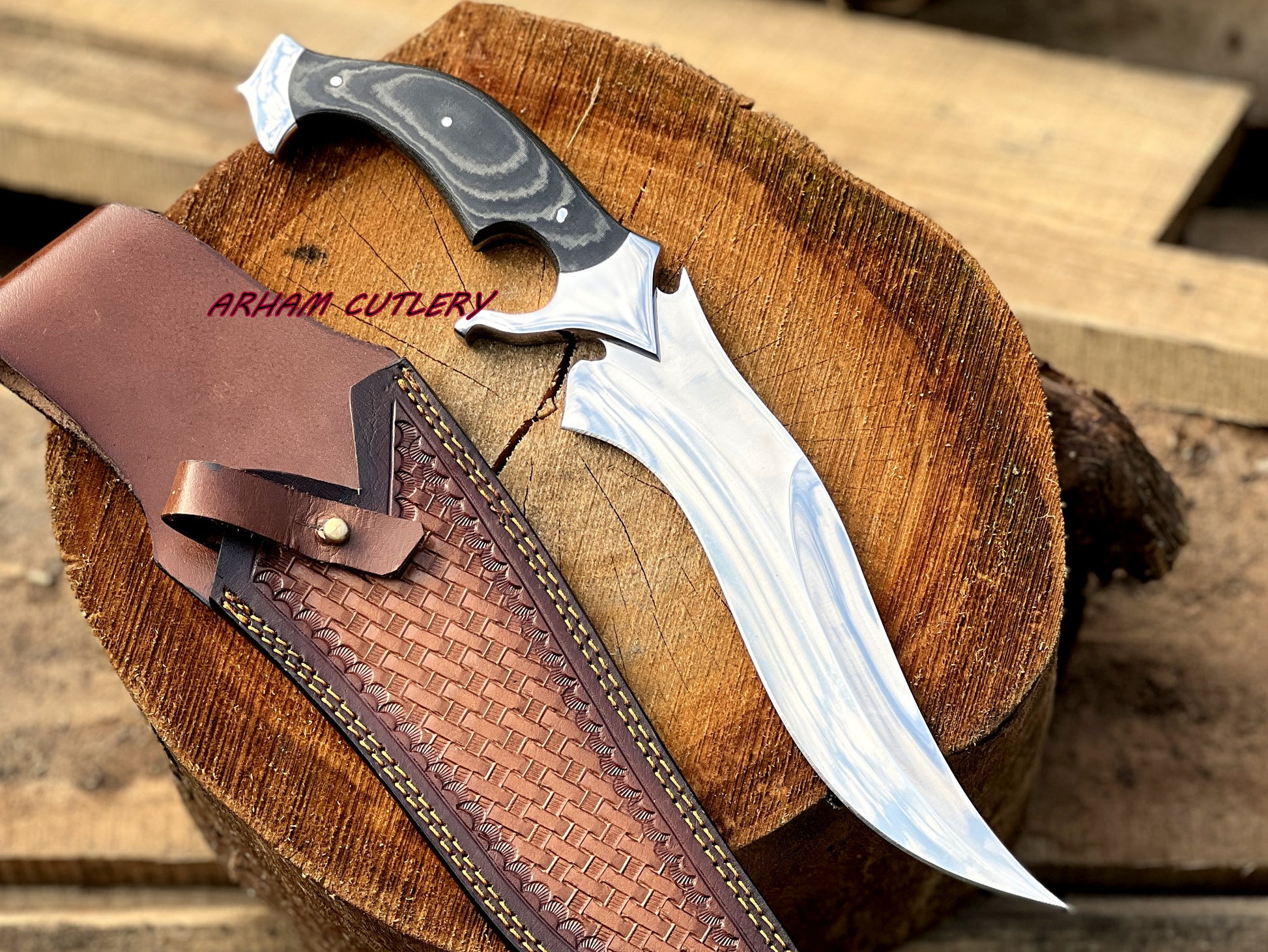 This handmade knife is a blend of strength, style, and performance. Crafted with high-quality D2 tool steel, the mirror-polished 9.5-inch blade is designed to deliver razor-sharp cutting power, making it ideal for hunting, outdoor survival, and collectors.