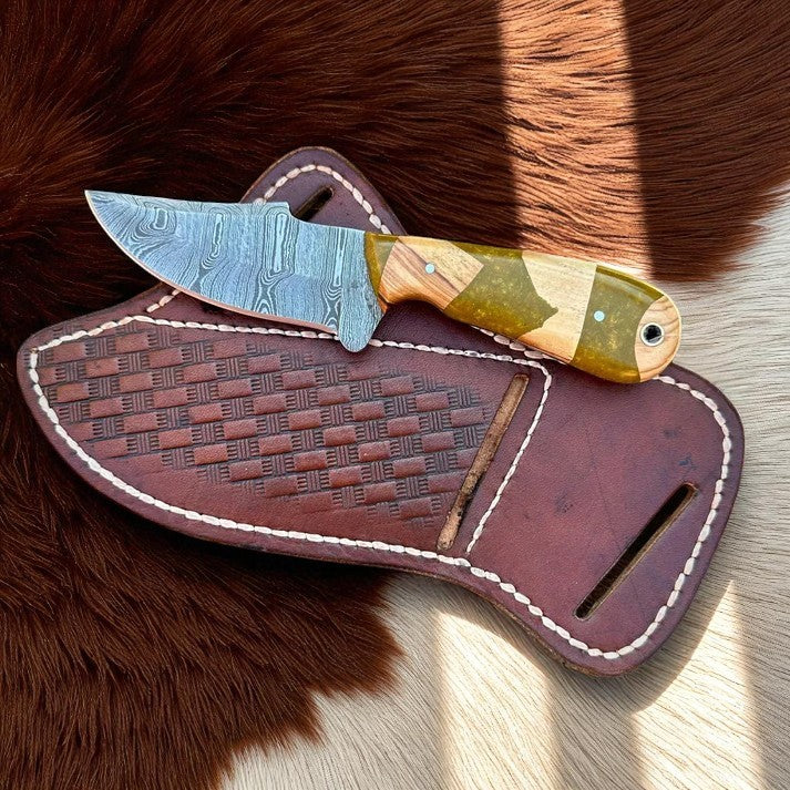 Damascus Belt Knife – Resin Wood Handle | Handmade by Arham Cutlery