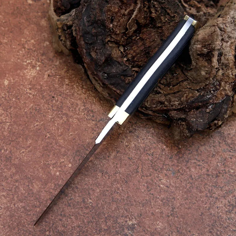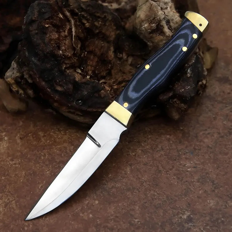 The black Micarta handle provides a modern, rugged appearance while offering excellent grip and moisture resistance. Ergonomically shaped for comfort, the handle is secured with brass pins and complemented by polished brass accents, adding durability and a refined finish.