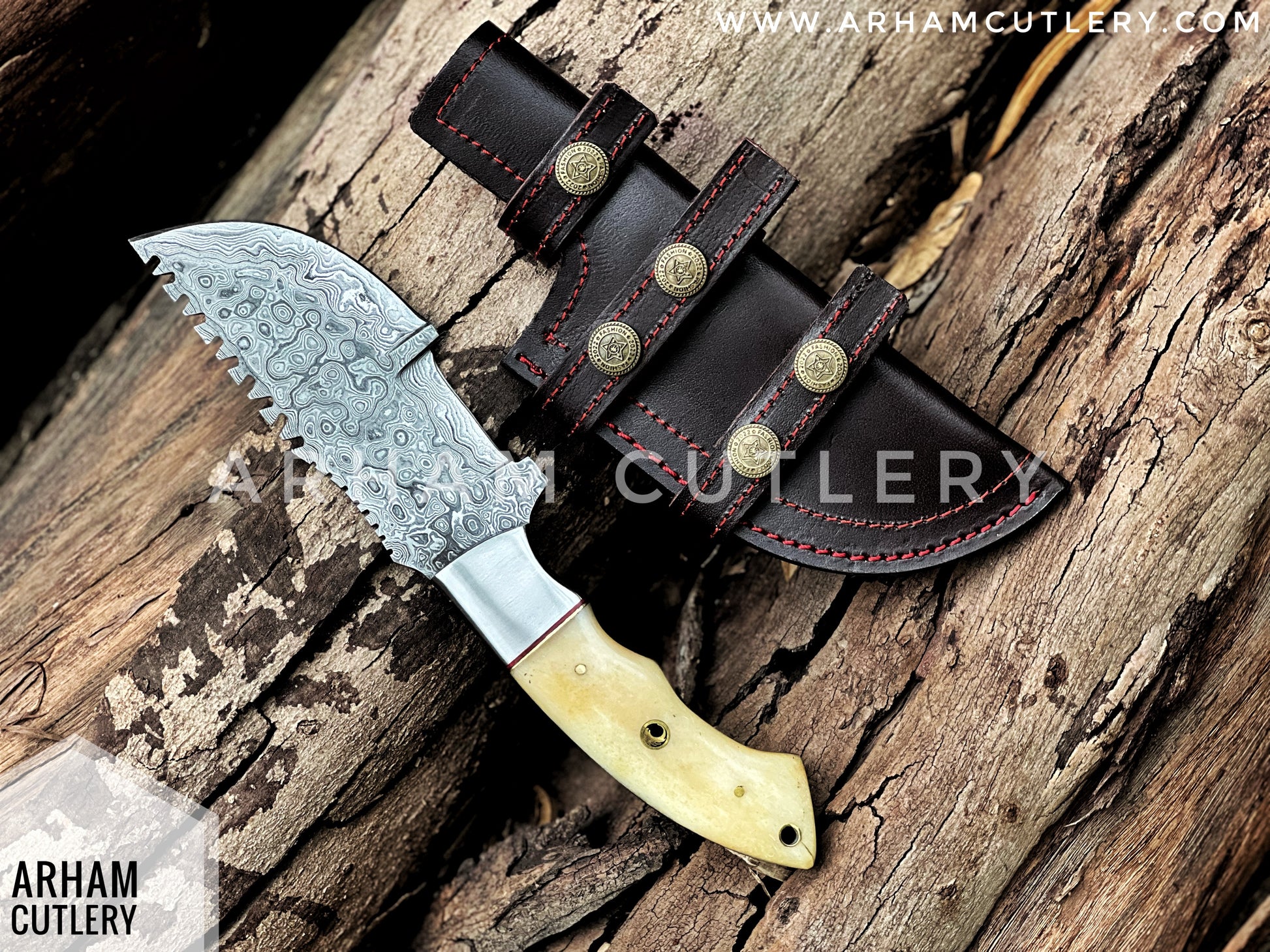 Handmade Damascus Steel Tracker Knife - Camel Bone Handle & Leather Sheath , Best Outdoor Knife