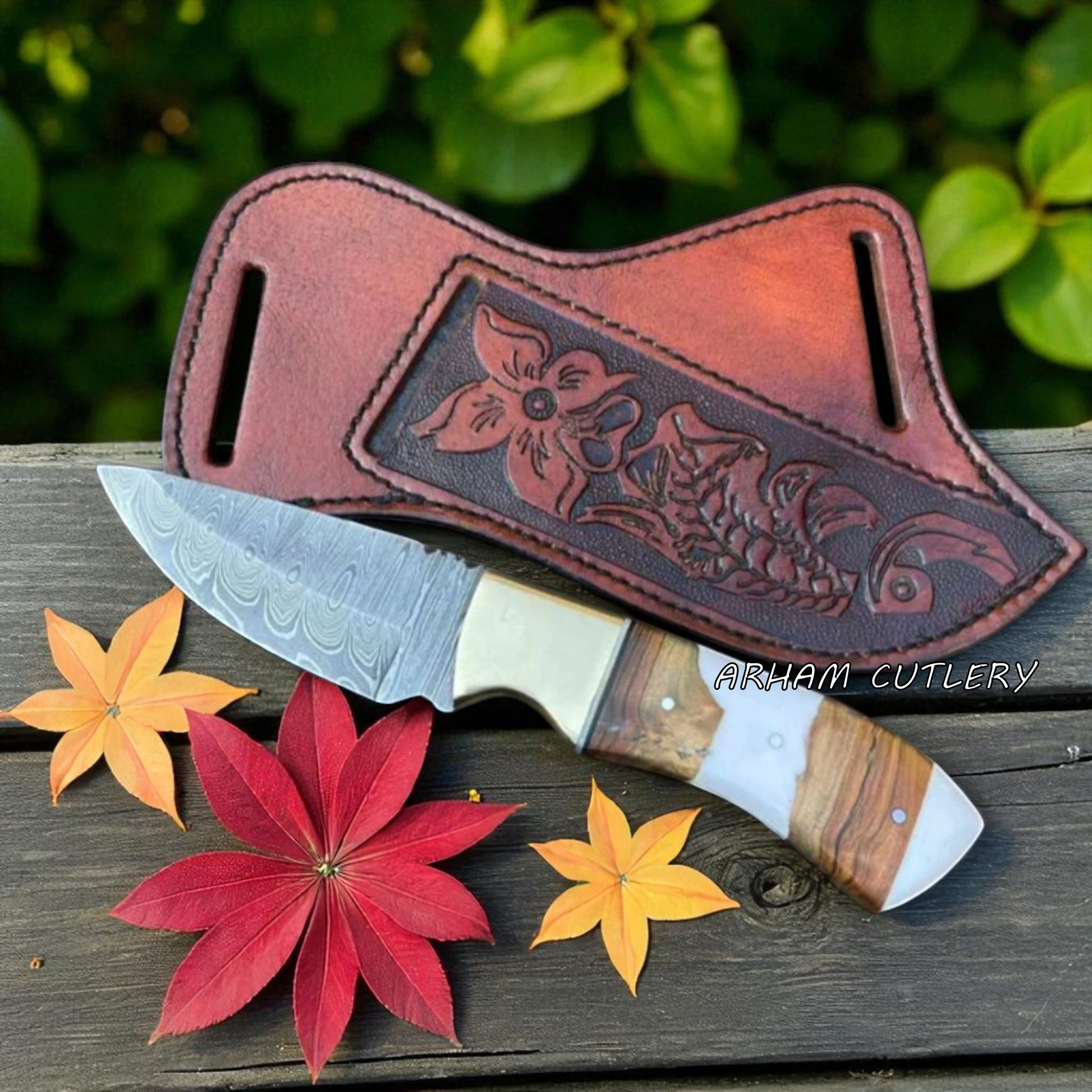 This knife features a stunning Damascus steel blade with a mesmerizing wave pattern, paired with a high-polish brass bolster that offers both strength and style. The hybrid handle, crafted from polished resin and natural wood grain, fits comfortably in the hand and adds a refined touch. It comes with a custom hand-engraved leather sheath featuring a floral pattern — making this a standout piece for outdoor enthusiasts and collectors alike.