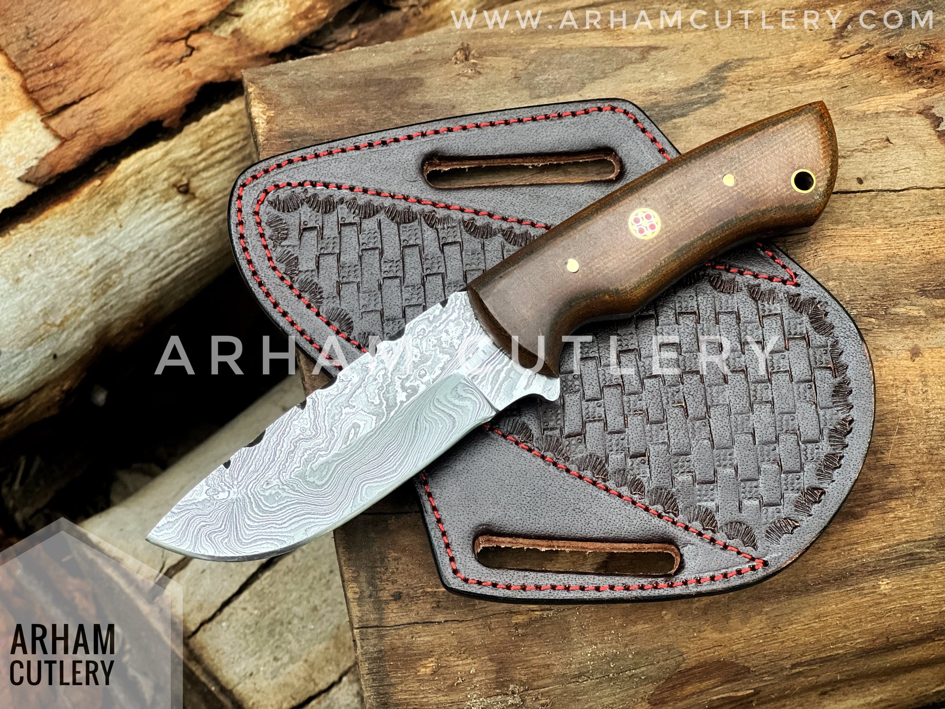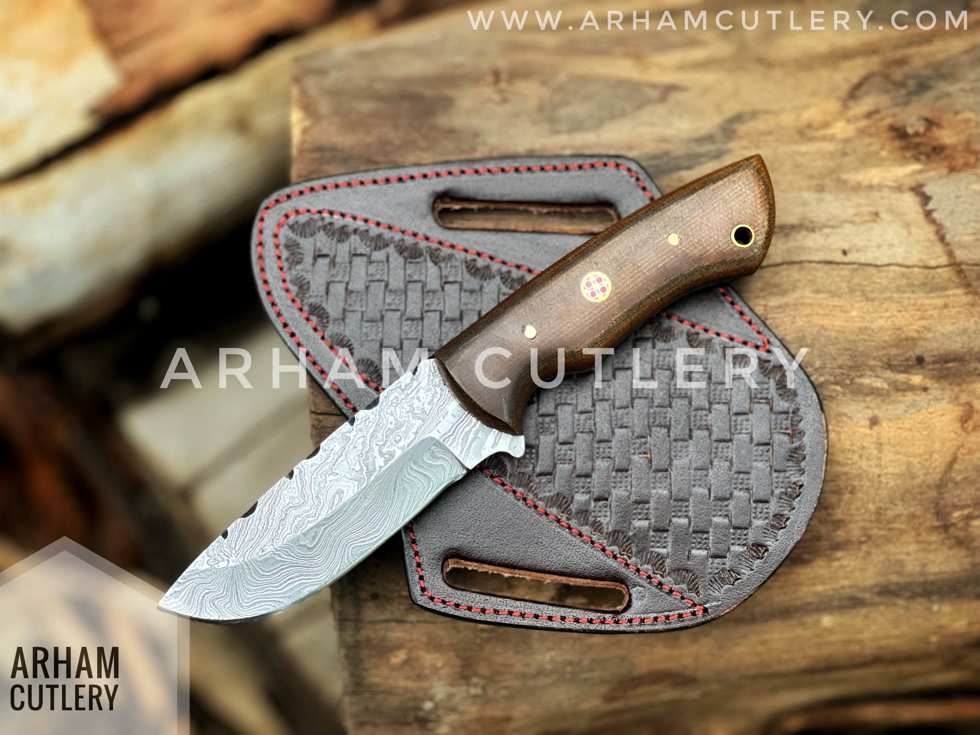Take your hunting game to the next level with our expertly handcrafted Damascus steel knife, paired with a rugged cowhide leather sheath. The blade's distinctive patterned steel is forged from high-carbon content, ensuring exceptional strength, durability, and razor-sharp edge retention. The ergonomic handle is designed for comfort and grip, while the cowhide leather sheath provides a secure and stylish carry option. This premium hunting knife set is built to withstand the toughest outdoor conditions and make a statement in the field.