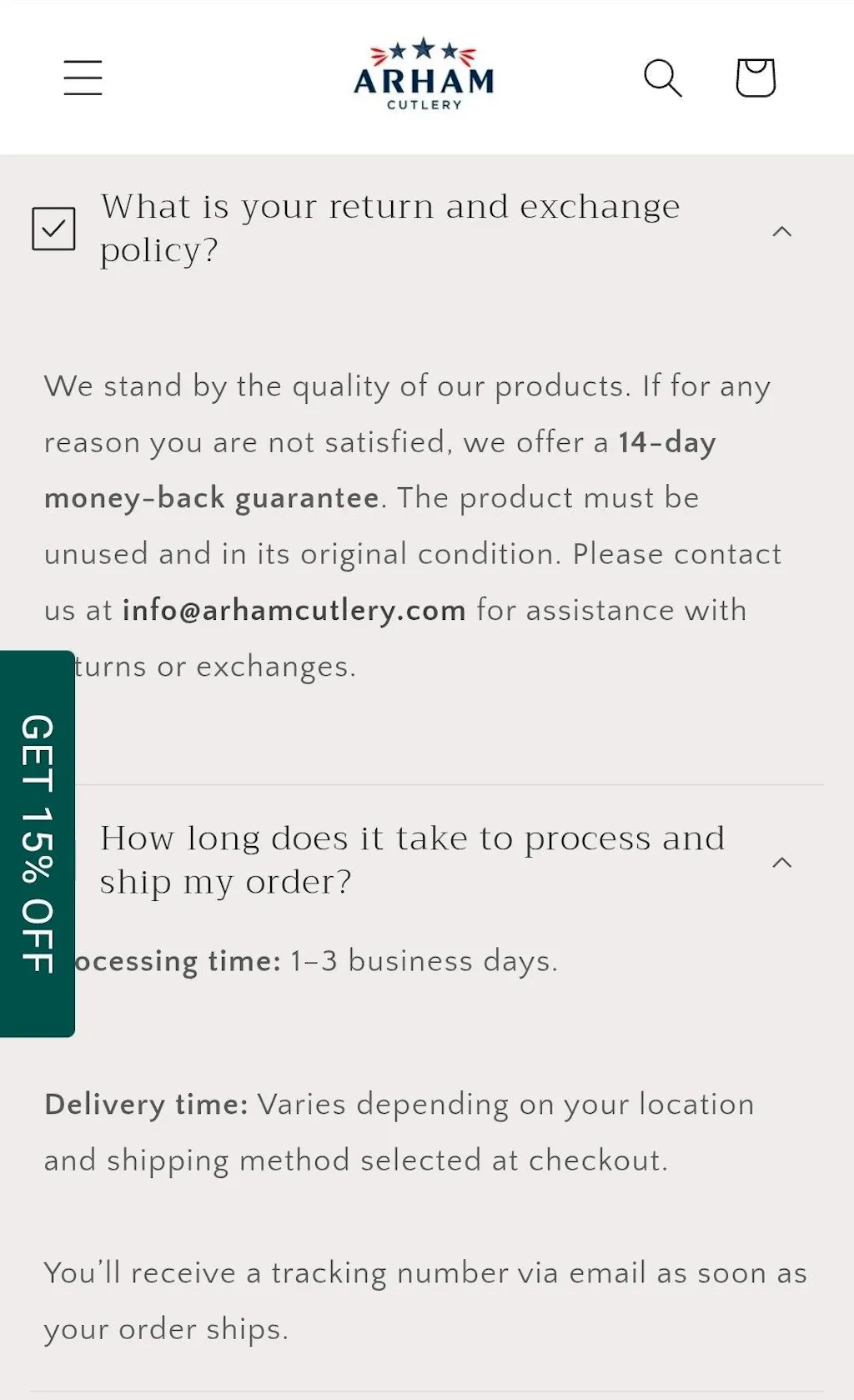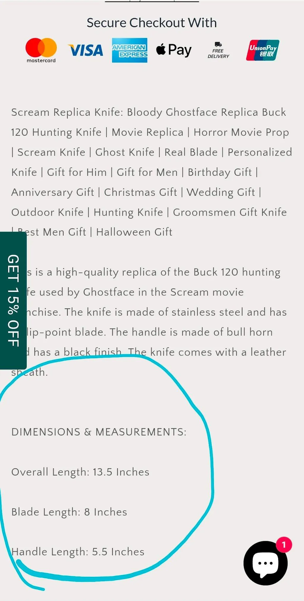 I ordered the Scream Buck 120 replica knife on November 22nd and did not receive it until December 17th despite website stating 1-3 day order processing and the seller would not respond to order inquiries. When I did receive the knife it was not what I ordered and instead had a 6 inch blade instead of an 8 inch blade and did not look like what was on the website. When I reached out to Arham cutlery they tried saying it was "a custom order". Nice try but give me my money back!