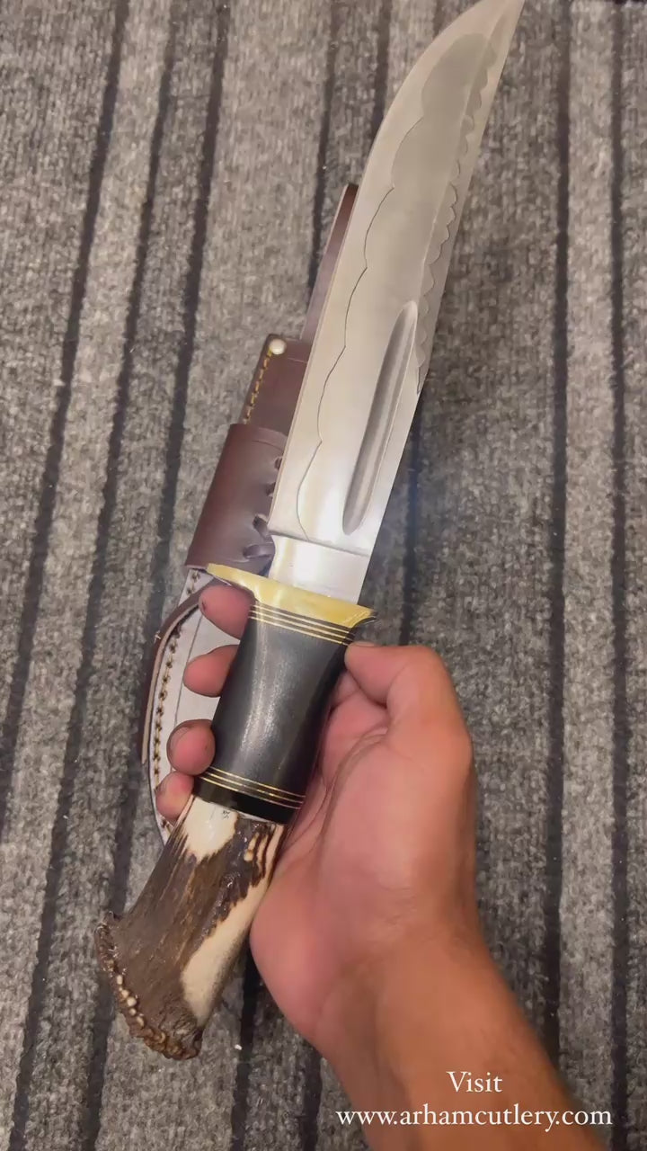 Unleash the hunter within with our exquisite handmade knife, crafted from high-carbon J2 stainless steel and adorned with stunning stag horn and brass guard accents. This masterpiece of craftsmanship boasts exceptional hardness and durability, with a Rockwell hardness of 61 HRC. The ergonomic design and premium materials ensure a comfortable grip and precise control, making it perfect for outdoor enthusiasts, collectors, and anyone who appreciates fine craftsmanship.
