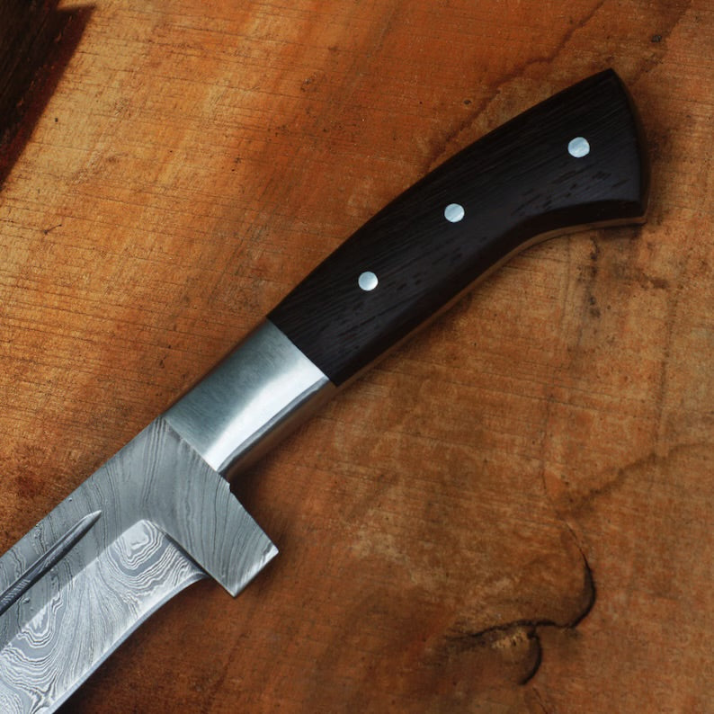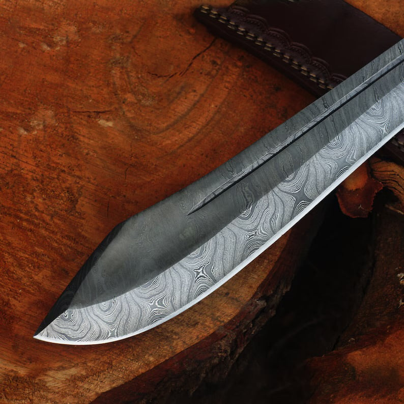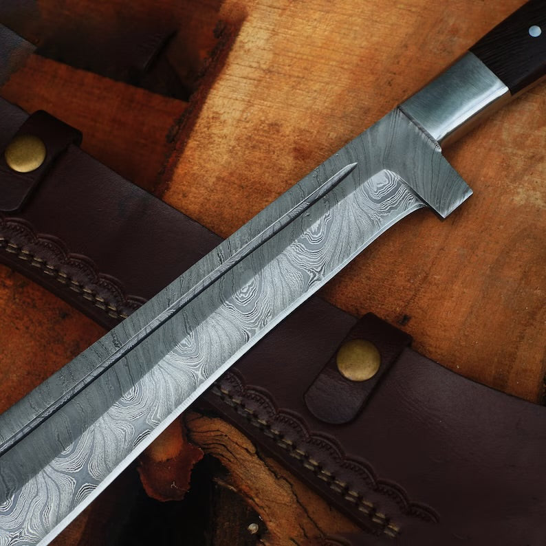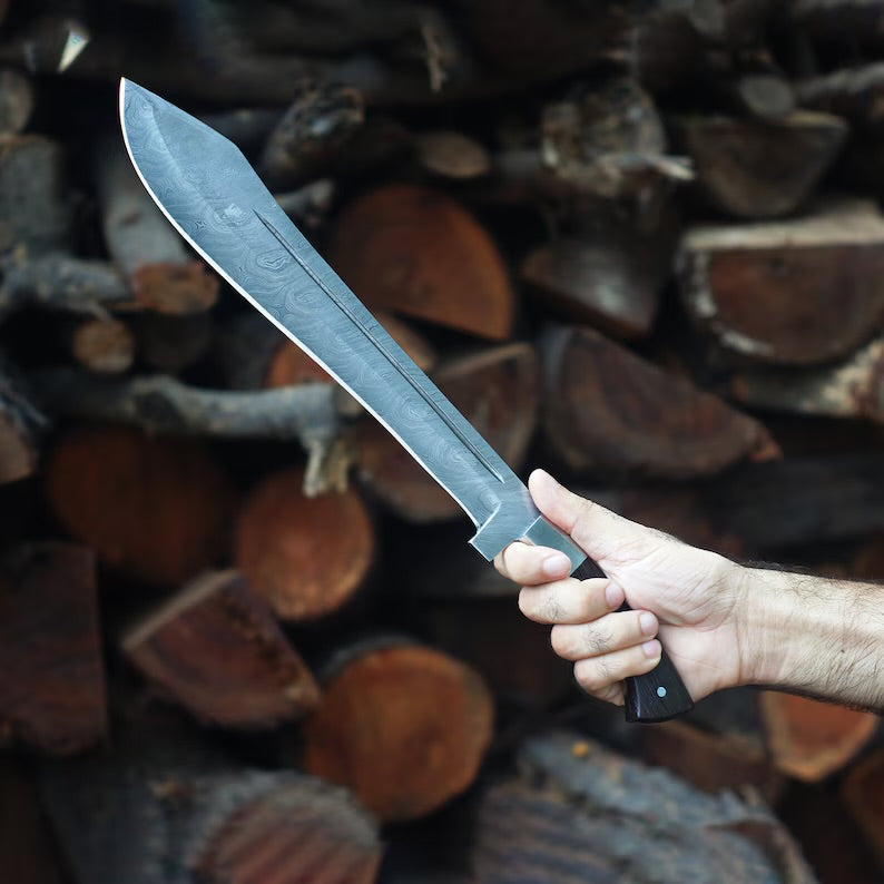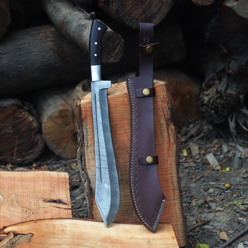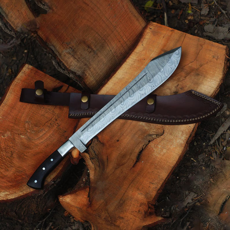 Experience the ultimate blend of artistry and functionality with our handmade Damascus steel machete. Crafted with precision and passion, this machete is a testament to exceptional craftsmanship. Its razor-sharp blade, forged from high-quality Damascus steel, ensures superior performance in outdoor adventures, survival situations, camping trips, and bushcraft activities. With its exquisite design and unmatched durability, this machete is a must-have tool for outdoor enthusiasts and collectors alike. Explore our collection and elevate your outdoor experiences with our handmade Damascus steel machete.
