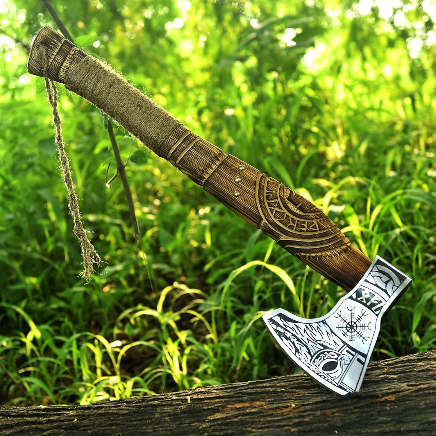 - [THIS VIKING AXE PERFECT FOR OUTDOOR ACTIVITIES] This is a perfect axe tool for outdoor camping, hunting, hiking, fishing and self-defense. It is designed for throwing and has a very sharp blade that can easily cut through wood axe. The leather sheath provides a secure and comfortable grip.