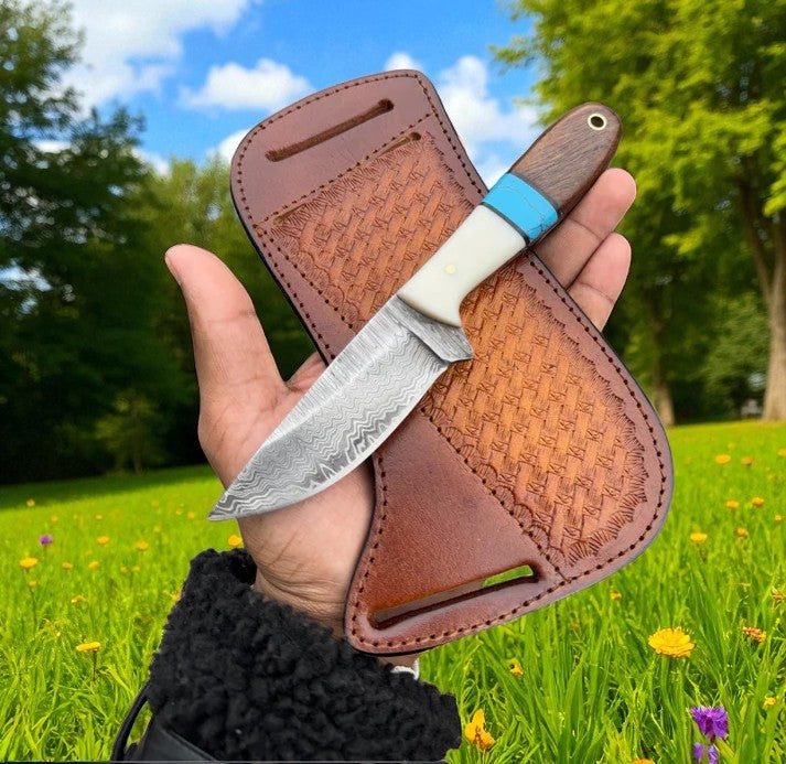 The beautifully patterned Damascus steel blade is razor-sharp and full-tang, while the handle combines natural bone, deep walnut wood, and bold sky-blue resin — a true symbol of frontier craftsmanship. It's paired with a hand-tooled basketweave leather sheath, built to ride your belt through every storm, sunrise, and season.