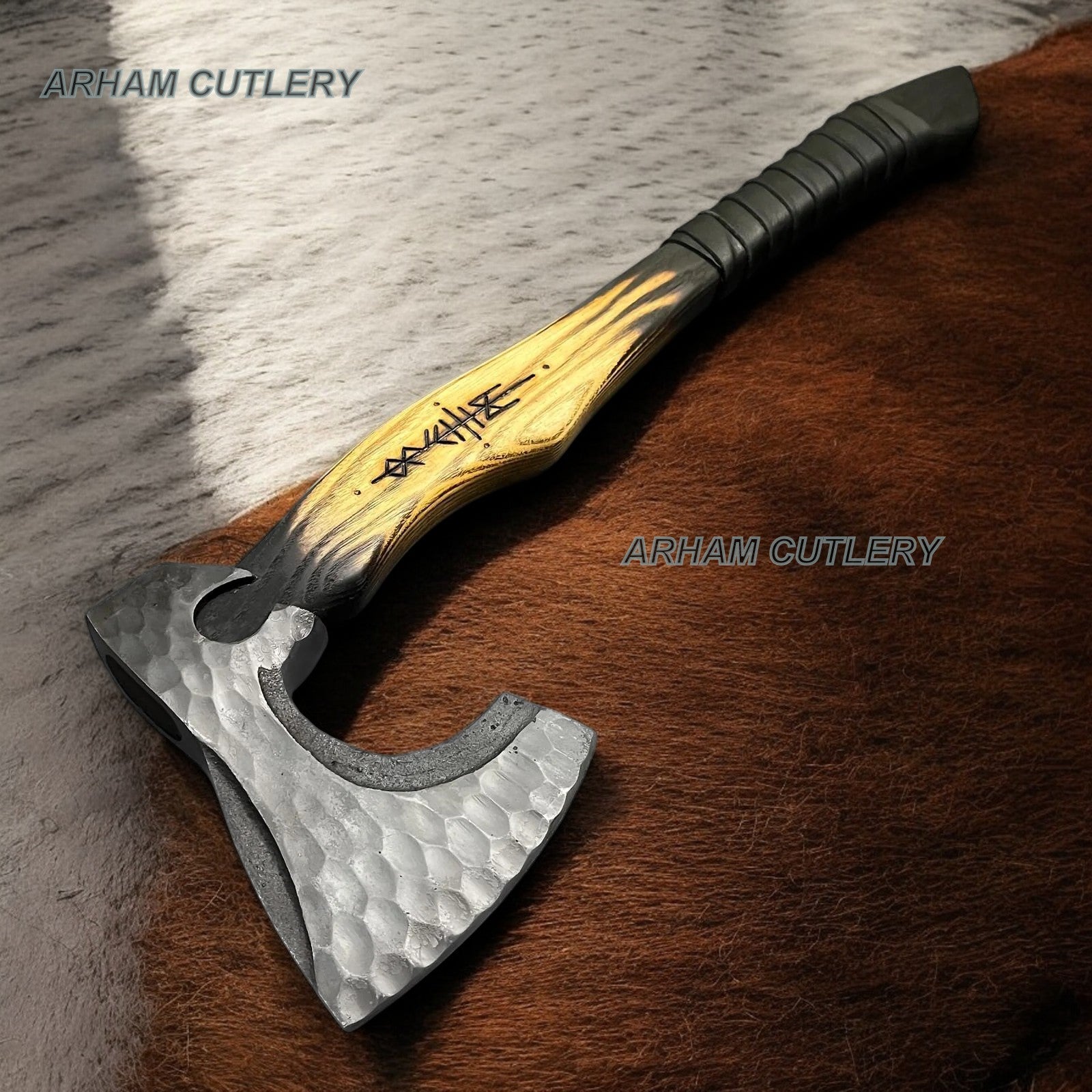 This show-stopping hatchet features a uniquely designed axe head with a bevelled and textured finish, with a unique circular cut out where the head meets the haft. The part-burnt Ash Haft is waxed whilst warm to bring out the grain, and features a chunky leather grip and a hand-burnt kinship bind rune, incorporating the Mannaz and Othila rune. This makes for a Hatchet that not only looks the business but has great functionality to boot!