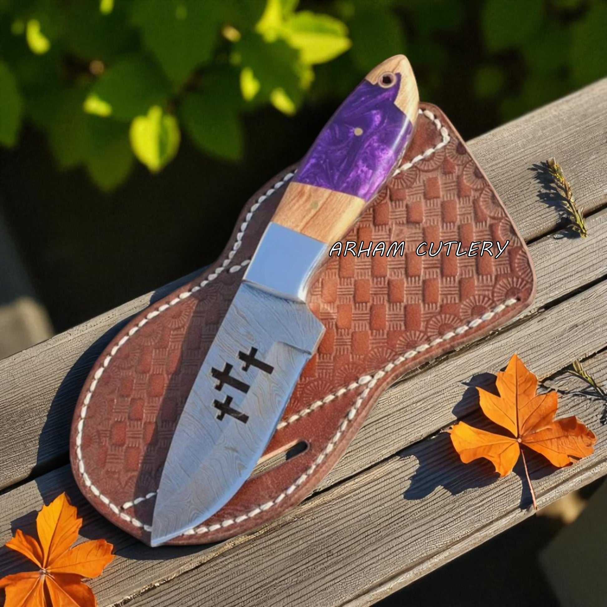 This handcrafted beauty features a hand-forged Damascus steel blade with a distinctive triple cross cutout, combining function with visual appeal. The handle is a hybrid of natural olive wood and vibrant purple resin, giving it a comfortable grip and unmatched style. Ideal for skinning, hunting, and everyday carry, this knife comes with a premium hand-tooled leather sheath for secure storage and carry.