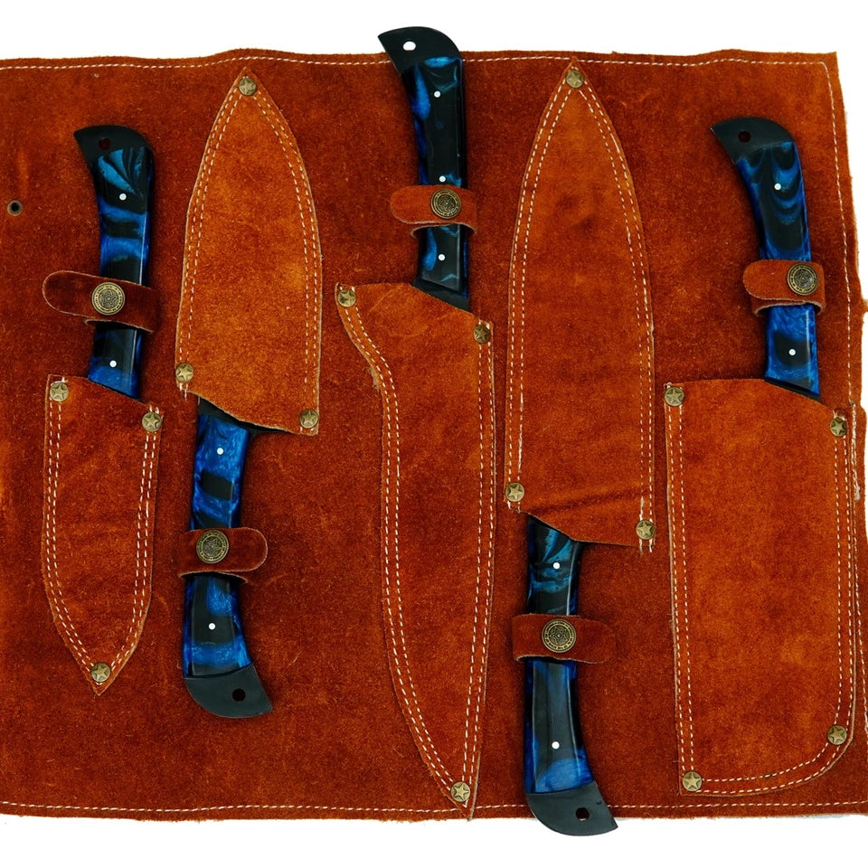 Handcrafted D2 Steel 5-Piece Chef Knife Set – Hammered Black Blades, Blue Resin Handles & Leather Carry Bag | Arham Cutlery