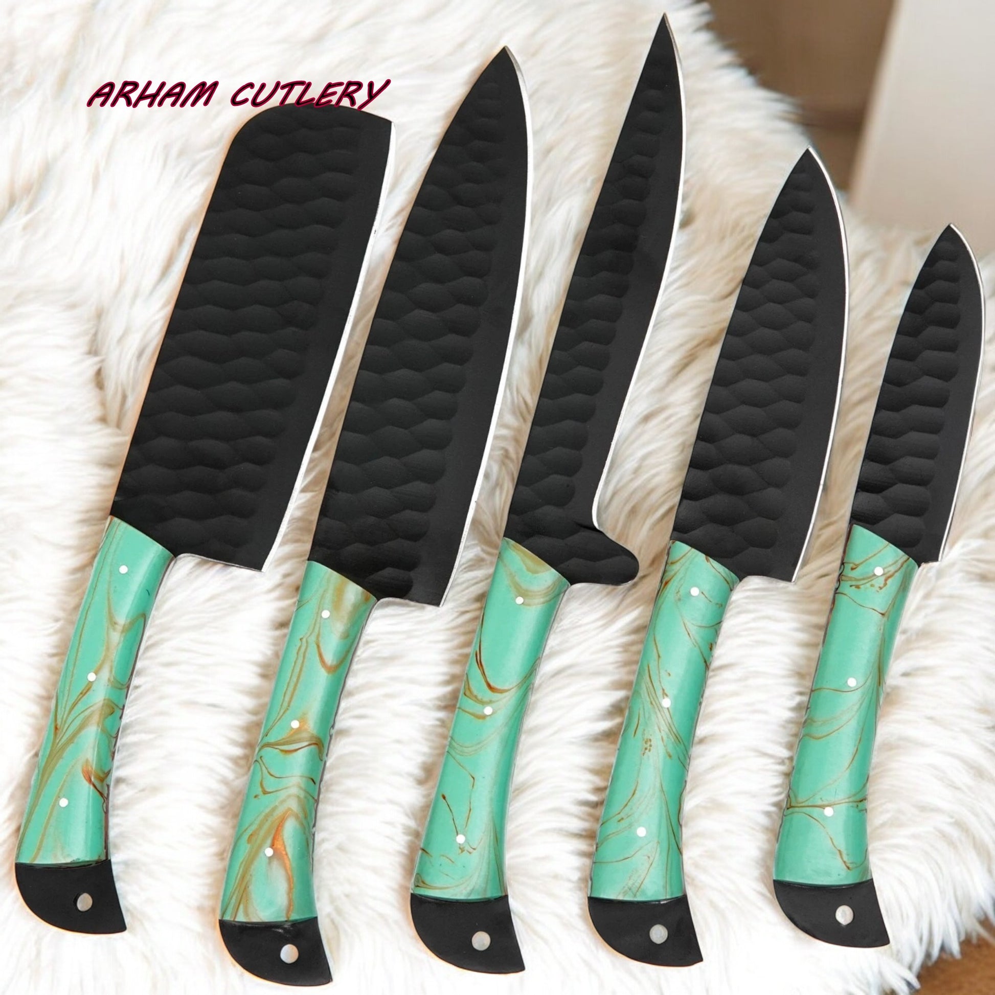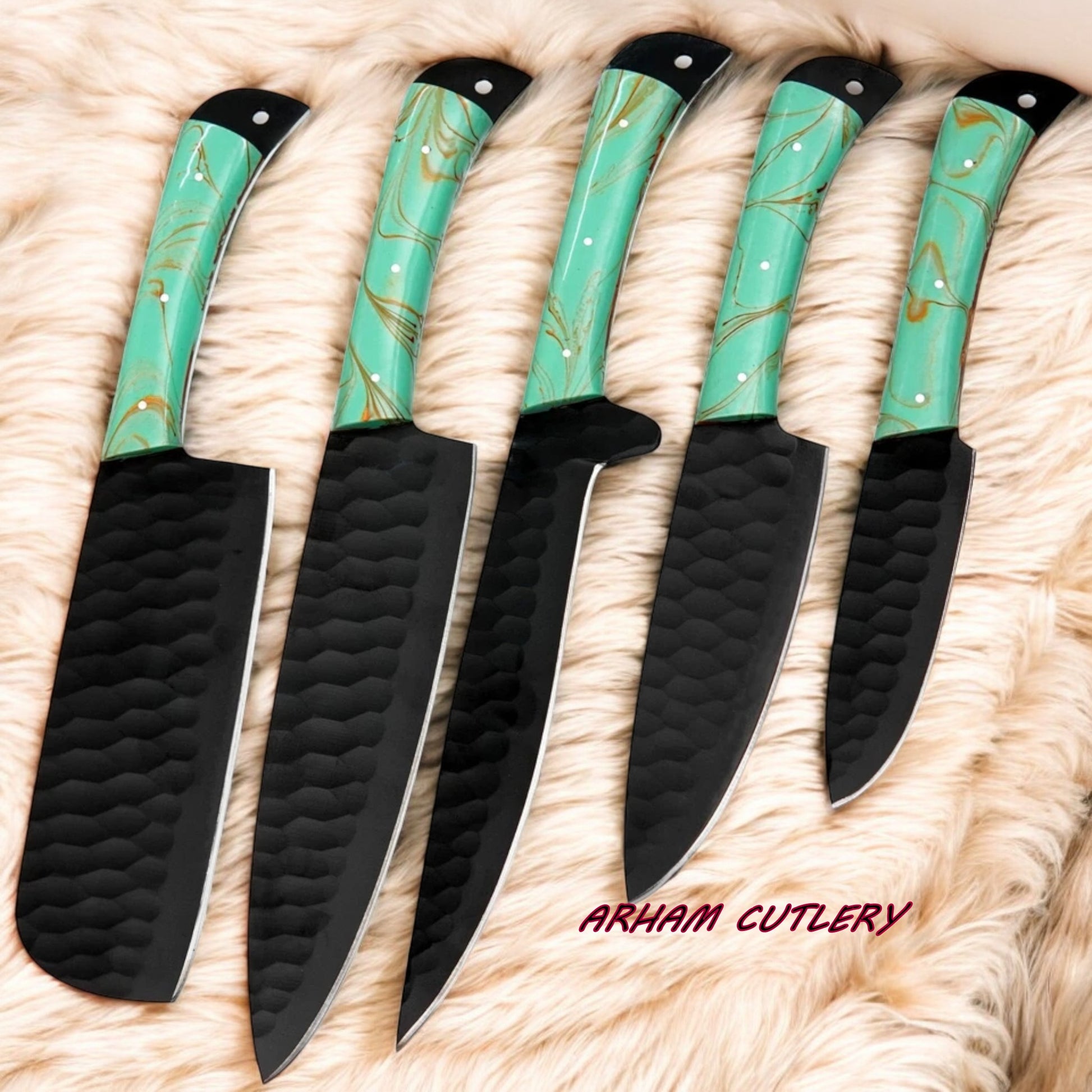 Handmade D2 Steel 5-Piece Chef Knife Set – Hammered Black Blades, Green Resin Handles & Leather Roll | Arham Cutlery