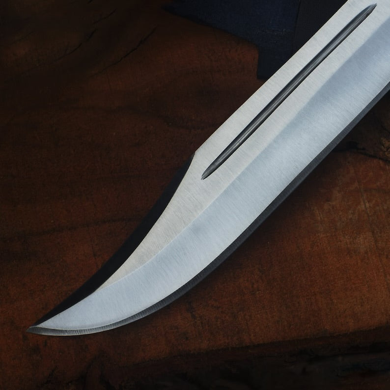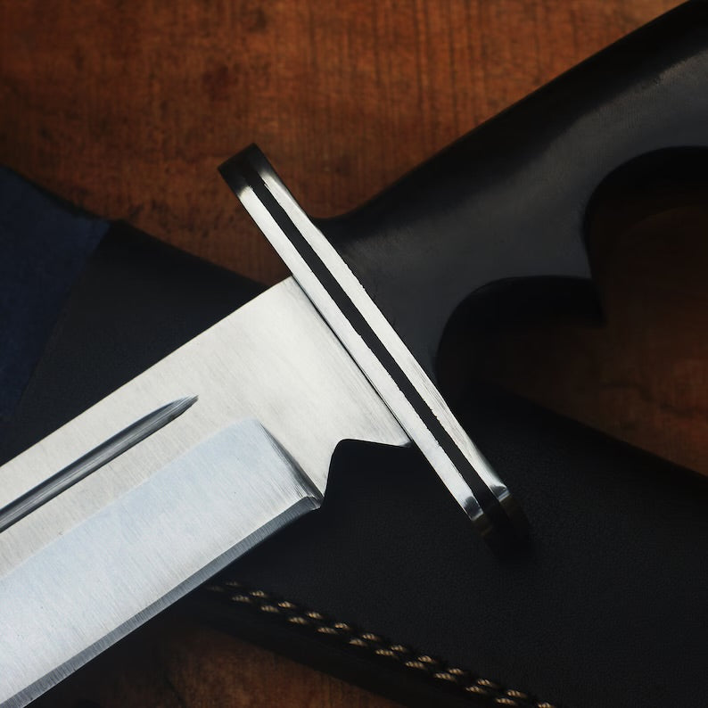 This is a high-quality replica of the Buck 120 hunting knife used by Ghostface in the Scream movie franchise. The knife is made of stainless steel and has a clip-point blade. The handle is made of bull horn and has a black finish. The knife comes with a leather sheath.